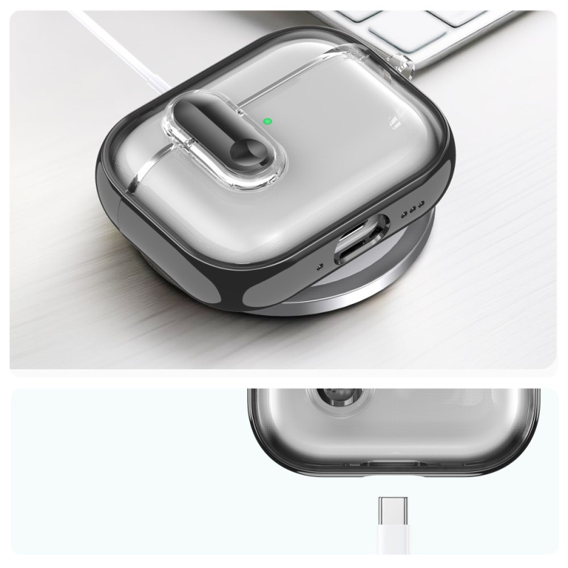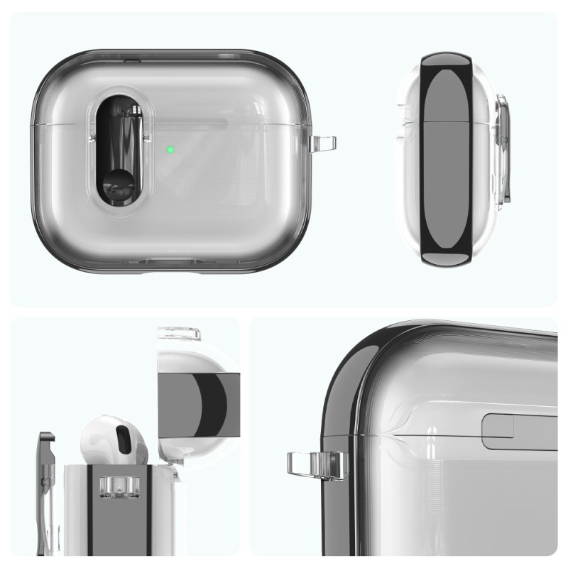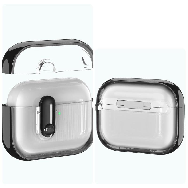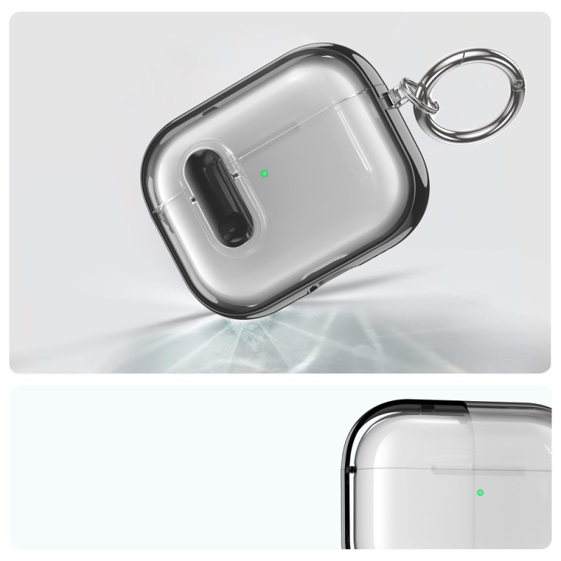 Protégez vos AirPods Pro 3 avec élégance grâce à cet étui transparent au design sophistiqué. Son cadre électrodéposé offre une finition brillante tandis que le mousqueton intégré facilite le transport. Compatible charge filaire et sans fil.