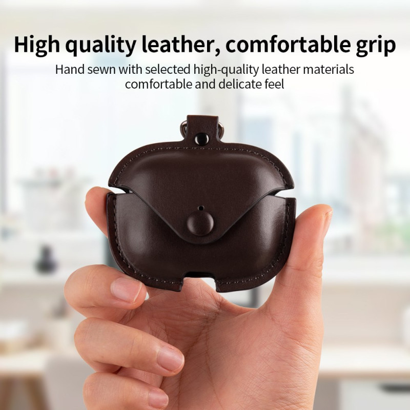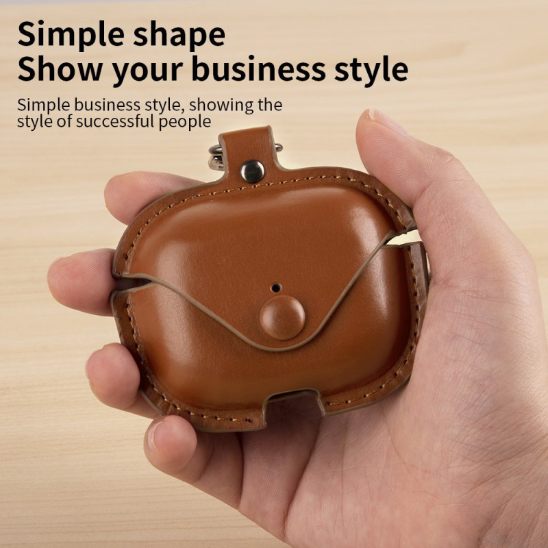 Protégez élégamment vos AirPods Pro 3 avec cet étui en cuir premium et PC robuste. Design professionnel avec fermeture à bouton-pression et mousqueton pratique pour l'attacher à vos clés. Protection intégrale contre les rayures et la poussière.