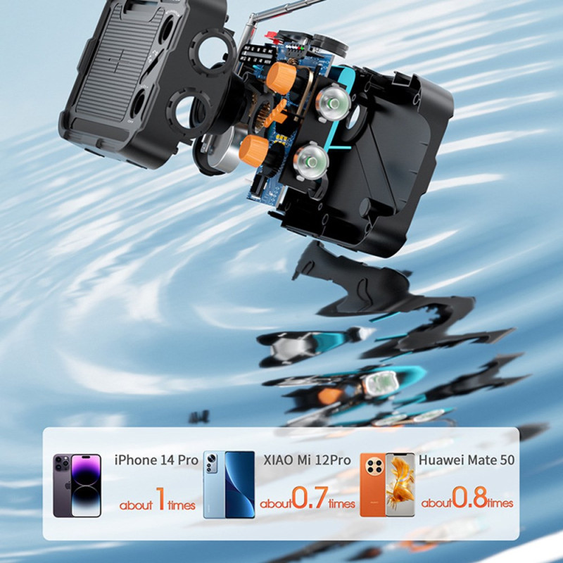 La batterie d’urgence multifonction Outdoor 5000mAh combine charge solaire, manivelle et radio FM/AM pour une autonomie totale en extérieur. Équipée d’un panneau solaire 5.5V/55mA, d’une sortie USB-A 5V/2.1A et d’un port Type-C, elle se recharge dans toutes les conditions. Son double éclairage LED (1W 120 lumens + 6W 500 lumens) éclaire efficacement les zones proches ou lointaines. Compacte, légère (300 g) et fabriquée en ABS ignifugé, elle intègre une batterie polymère 5000mAh fiable, idéale pour le camping et les urgences.
