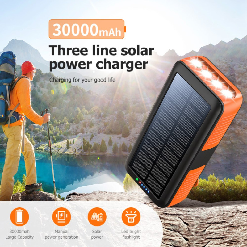 Lorsque l'accès à l'électricité n'est pas garanti, cette Batterie Externe devient un équipement de survie essentiel. Dotée d'une capacité massive de 30000mAh, elle est conçue pour les longues expéditions et les situations d'urgence. Sa double méthode de recharge unique – solaire et manivelle – assure une autonomie constante, même hors réseau. Certifiée IP66, elle est solide, durable et résiste aux projections d'eau et à la poussière. Pour la sécurité, elle intègre une puissante lampe torche à 4 LED avec mode SOS. De plus, les trois câbles détachables (Lightning, Type-C, Micro) éliminent le besoin de transporter des accessoires supplémentaires, offrant une polyvalence maximale.