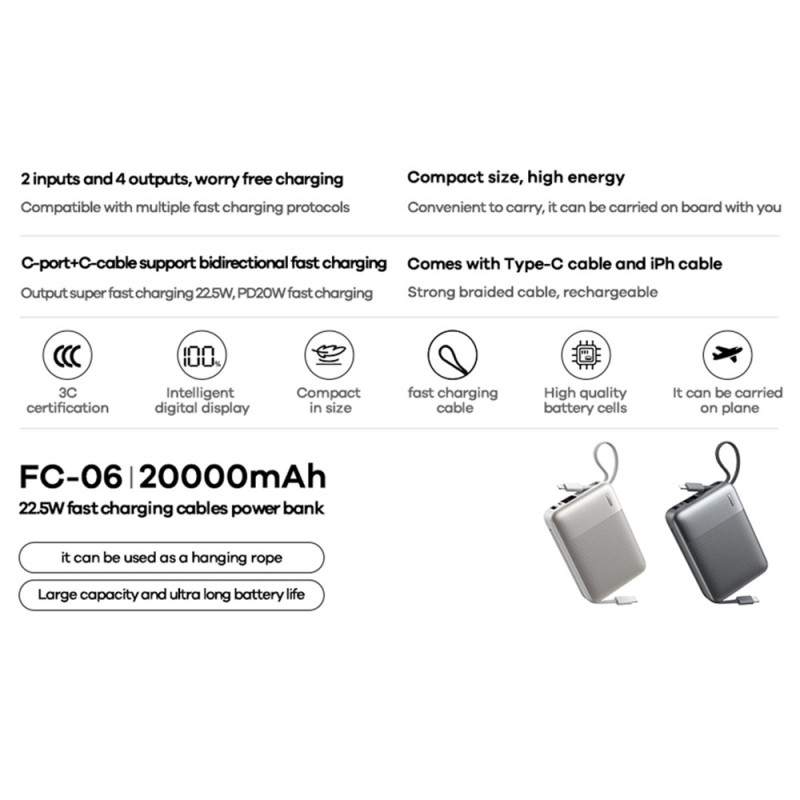 La gestion de l'autonomie et des câbles est simplifiée à son maximum avec cette unité portable REMAX de 20000mAh. Cette Batterie Externe haute capacité assure une durée de vie prolongée de vos dispositifs pour les vols longs courriers et les voyages. Elle intègre des câbles rétractables Lightning et Type-C, éliminant le besoin de transporter des accessoires supplémentaires. Elle supporte une charge ultra-rapide de 22.5W, notamment compatible avec la charge PD 20W des iPhone 15/16. Grâce à ses quatre options de sortie, elle permet d'alimenter plusieurs appareils simultanément. L'affichage LED numérique offre une lecture instantanée de l'énergie restante.