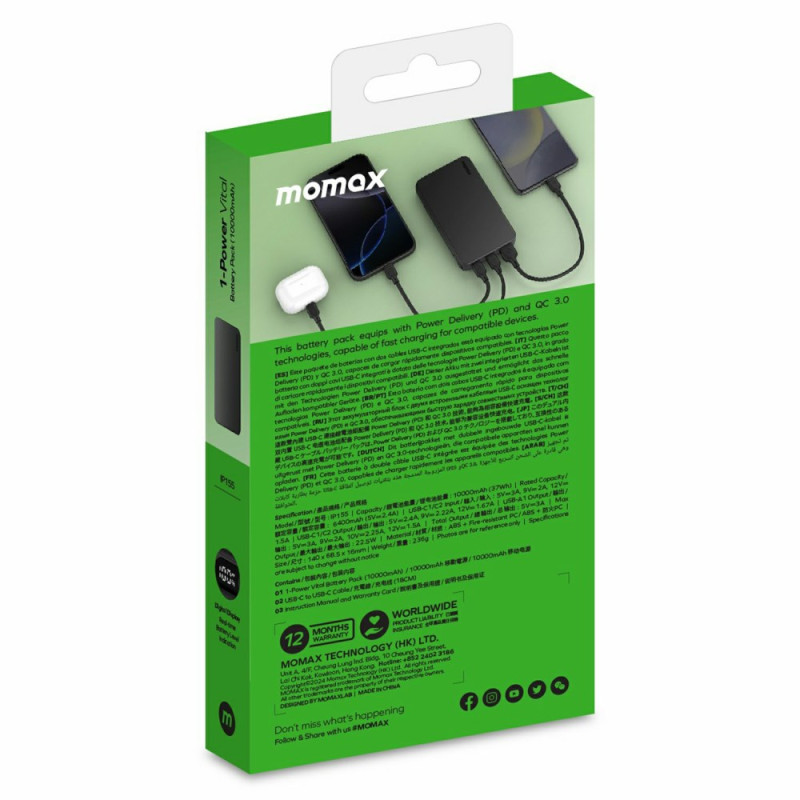 Élaborée pour être le parfait compromis entre puissance et portabilité, la Batterie Externe MOMAX Vital est l'accessoire indispensable de la mobilité quotidienne. Sa capacité de 10000mAh est idéale pour des recharges multiples, tandis que sa puissance de sortie atteint 22.5W via USB-A et 20W via USB-C, grâce à la technologie JSB-CPD. Elle permet d'alimenter simultanément jusqu'à trois dispositifs via ses ports polyvalents. Malgré ses performances, cette unité conserve un profil compact (16mm, 236g). L'écran numérique LED offre une surveillance précise et professionnelle de l'autonomie. Ce dispositif est conforme aux réglementations en vigueur pour garantir la sécurité d'utilisation.
