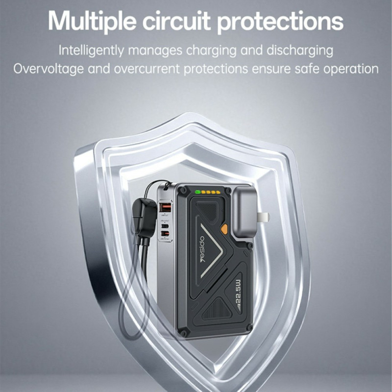 L'intégration d'un chargeur mural et d'une batterie sans fil dans une seule unité résout les défis de la charge multi-scénarios. Cette Batterie Externe YESIDO offre une double fonctionnalité AC/DC pour une polyvalence ultime. Elle délivre une charge magnétique sans fil jusqu'à 15W et une charge filaire rapide de 22.5W (via USB). Le dispositif inclut un support intégré permettant le visionnage horizontal pendant la charge. La sécurité est garantie par des puces de gestion intelligentes et une construction en PC ignifuge V0. Quatre indicateurs LED clairs fournissent un suivi précis et instantané du statut de la charge.