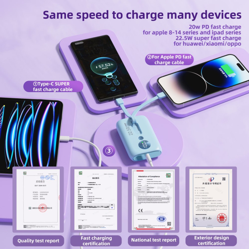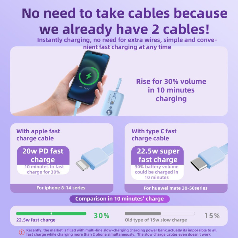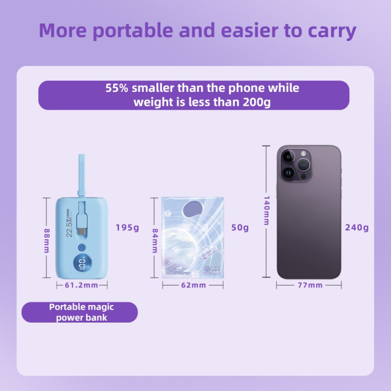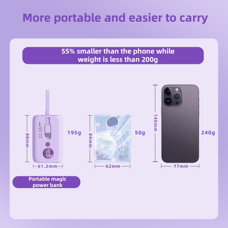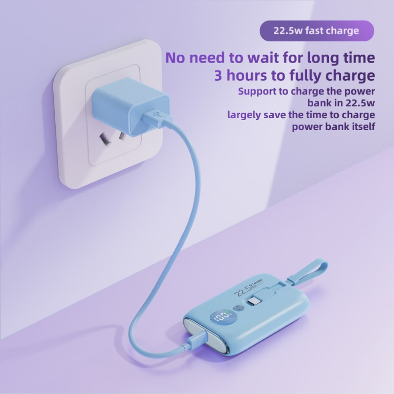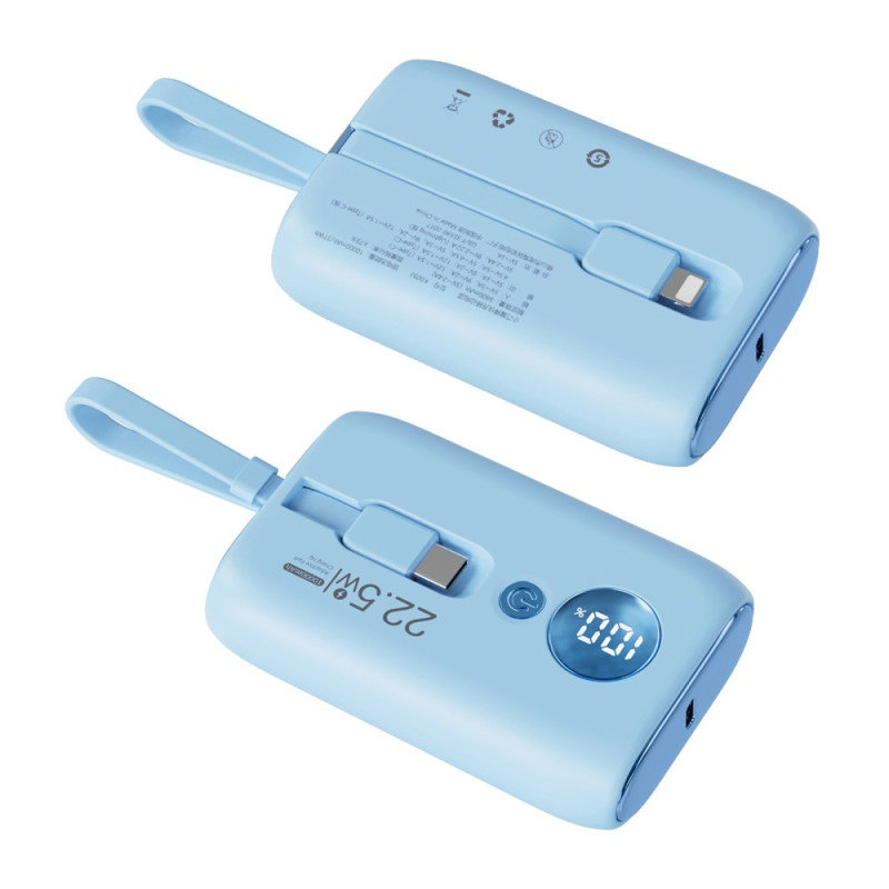 Le contrôle thermique avancé et l'intégration des câbles redéfinissent la charge rapide dans un format de poche. Cette Batterie Externe ROISKIN 10000mAh est conçue pour la commodité maximale : elle intègre deux câbles (Type-C et Lightning) qui servent également de dragonne. Sa puissance de charge atteint 22.5W (via le câble Type-C), tout en utilisant une puce nouvelle génération pour maintenir une basse température et préserver la santé des batteries. L'affichage numérique intelligent fournit le volume exact de batterie restant, remplaçant les voyants lumineux. Compacte et légère, elle est le parfait allié de la mobilité.