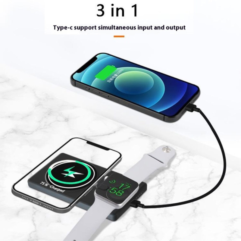 Cette batterie externe 3-en-1 de 5000mAh offre une solution complète pour recharger un smartphone, des écouteurs et une montre grâce à ses zones de charge dédiées. Son système magnétique assure une fixation stable et évite les glissements pendant l’utilisation. Compacte et facile à transporter, elle accompagne aisément les déplacements quotidiens. La charge sans fil est rapide et efficace, avec un rendement de 75 %, tandis que le port Type-C bi-directionnel permet aussi bien la recharge de la batterie que l’alimentation d’un autre appareil.