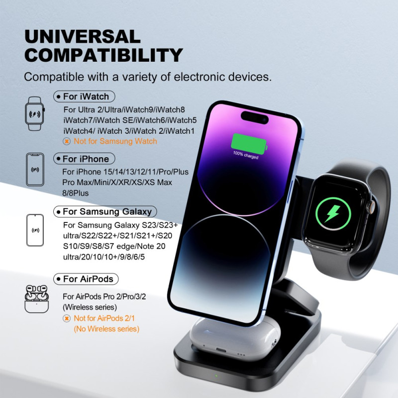 • Chargement sans fil 3-en-1 : Solution polyvalente permettant de recharger simultanément votre smartphone, votre Apple Watch et vos AirPods. Idéal pour réduire l'encombrement et maintenir tous vos appareils chargés
