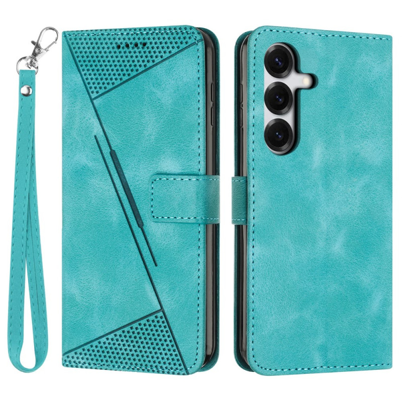 Étui élégant en cuir synthétique avec motif triangle imprimé pour Samsung Galaxy S26. Dispose de 3 emplacements pour cartes, d'une fermeture magnétique sécurisée et d'une dragonne détachable pour un transport facile.