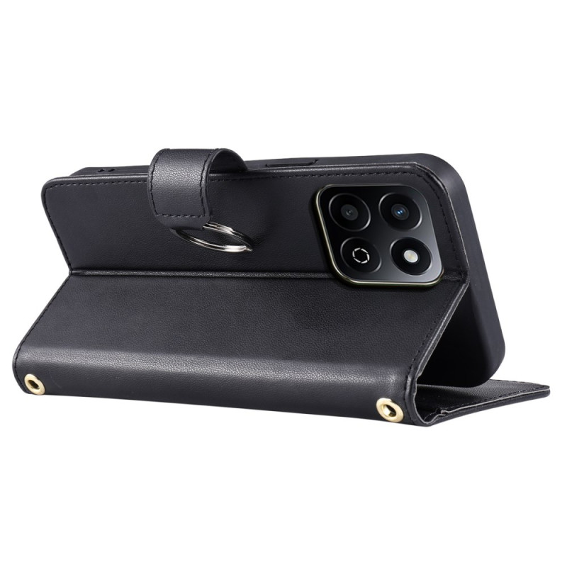 Étui portefeuille élégant en cuir avec design losange sophistiqué. Comprend un anneau clasp premium, 5 emplacements pour cartes, une poche pour pièces et un support pliable. Livré avec deux bretelles pour port à la main ou en bandoulière.