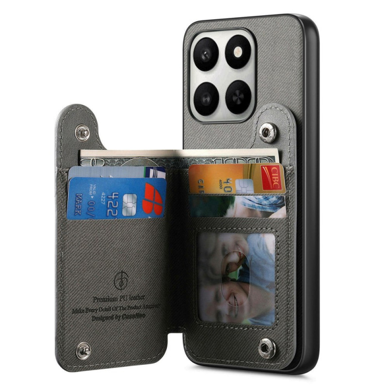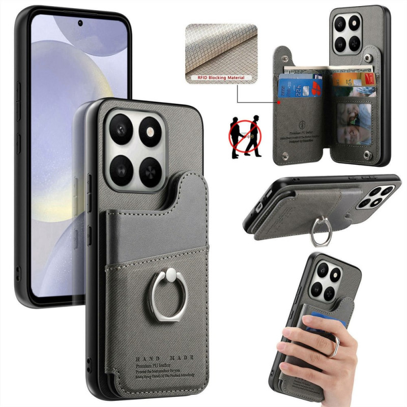 Étui multifonction en cuir, TPU et PC pour Honor 400 Smart 5G / 4G / X7d 5G / 4G. Dispose de fentes RFID pour 4 cartes, support ajustable, anneau rotatif à 360° et protection robuste. Design texturé élégant avec fermeture à pression pour un accès facile.