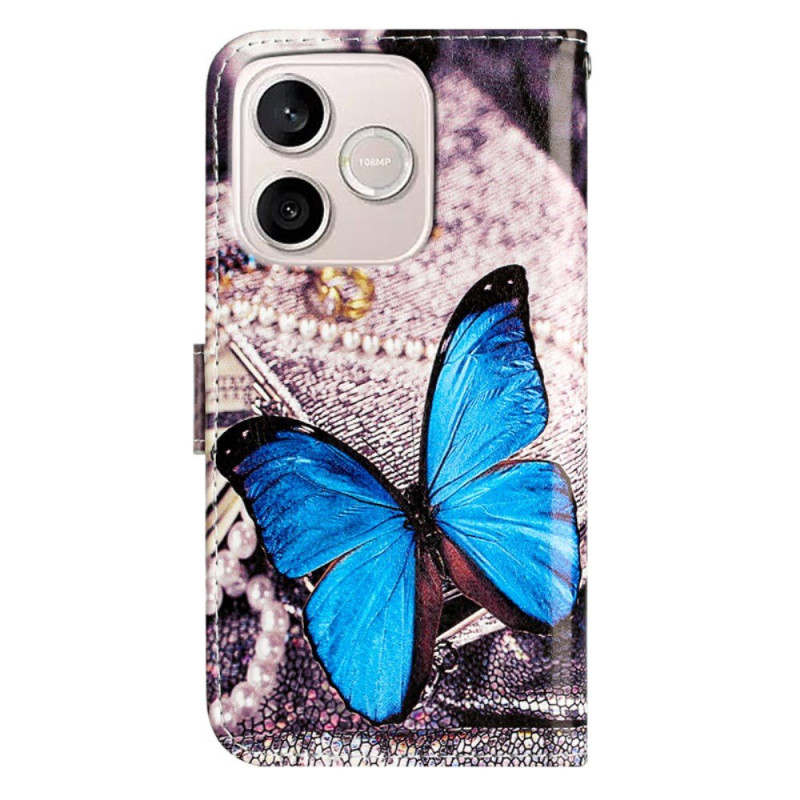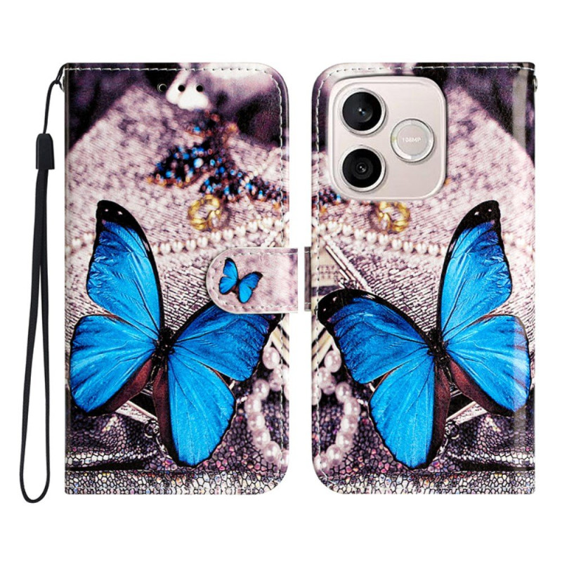 Motif papillons bleus élégant, slots pour cartes, support intégré et dragonne incluse.