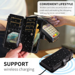 Étui multifonction élégant combinant protection renforcée et praticité. Dispose de 10 emplacements pour cartes, une poche zippée et des sangles détachables pour un transport mains libres. Finition pailletée glamour avec support pliable intégré.