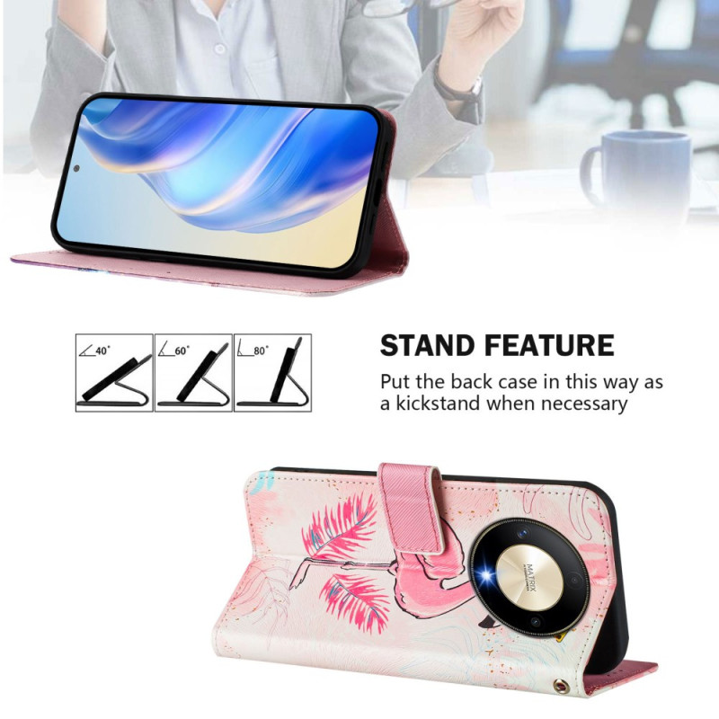 Étui portefeuille élégant avec motif oiseau coloré, support réglable multi-angles et dragonne de sécurité. Doté de 3 emplacements pour cartes et 1 pour espèces. Protection renforcée contre les chutes avec finition anti-traces.
