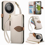 Étui portefeuille élégant avec fermoir magnétique en forme de feuille. Dispose de 3 emplacements pour cartes, 1 poche à billets et une poche zippée externe. Support intégré pour visionnage mains libres et dragonne amovible pour un transport facile.