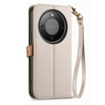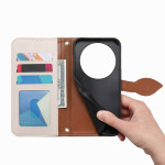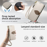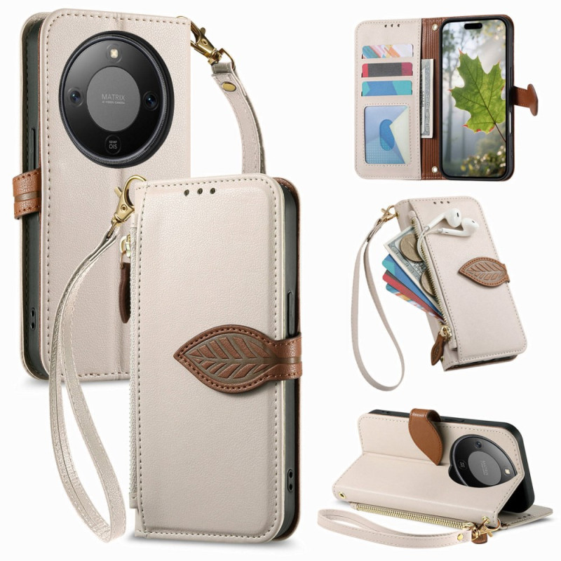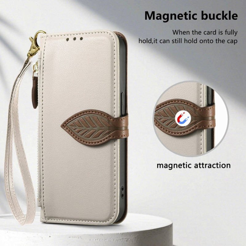 Étui portefeuille élégant avec fermoir magnétique en forme de feuille. Dispose de 3 emplacements pour cartes, 1 poche à billets et une poche zippée externe. Support intégré pour visionnage mains libres et dragonne amovible pour un transport facile.