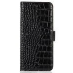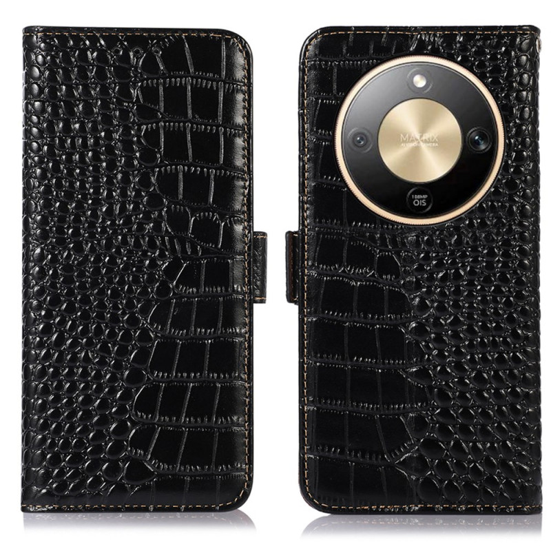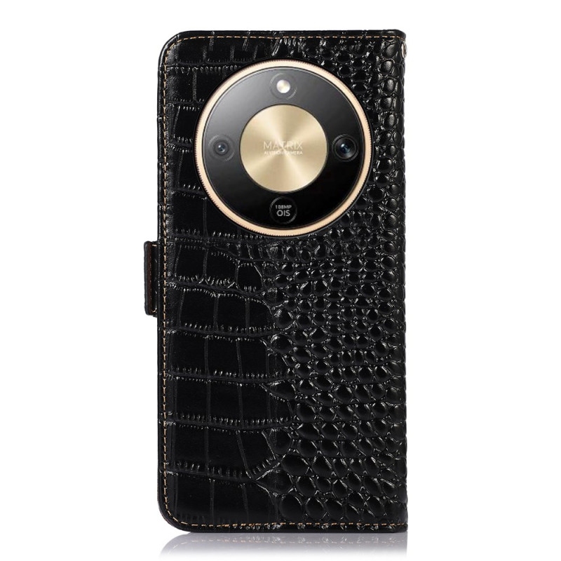 Étui portefeuille élégant en cuir véritable avec texture crocodile pour votre Honor Magic 8 Lite / X9d. Protection RFID intégrée, 3 emplacements pour cartes, 1 poche pour billets et support de visionnage ajustable.