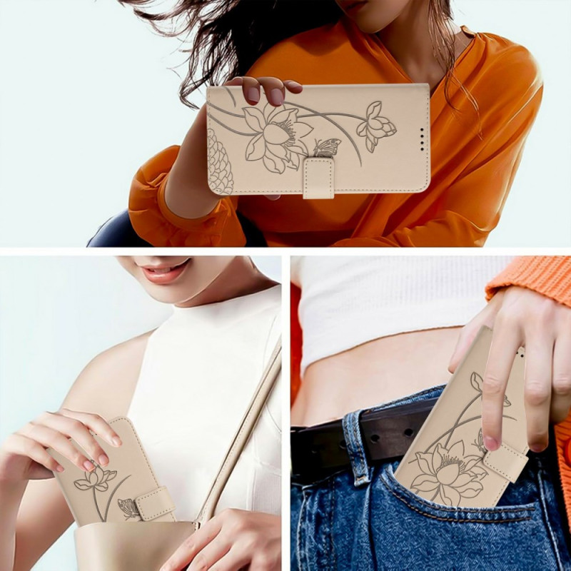 Élégant étui portefeuille en cuir avec motif lotus gravé pour Honor X5c Plus 4G. Fonction support intégrée, multiples emplacements pour cartes et dragonne détachable. Protection complète avec bords surélevés et coques renforcées.