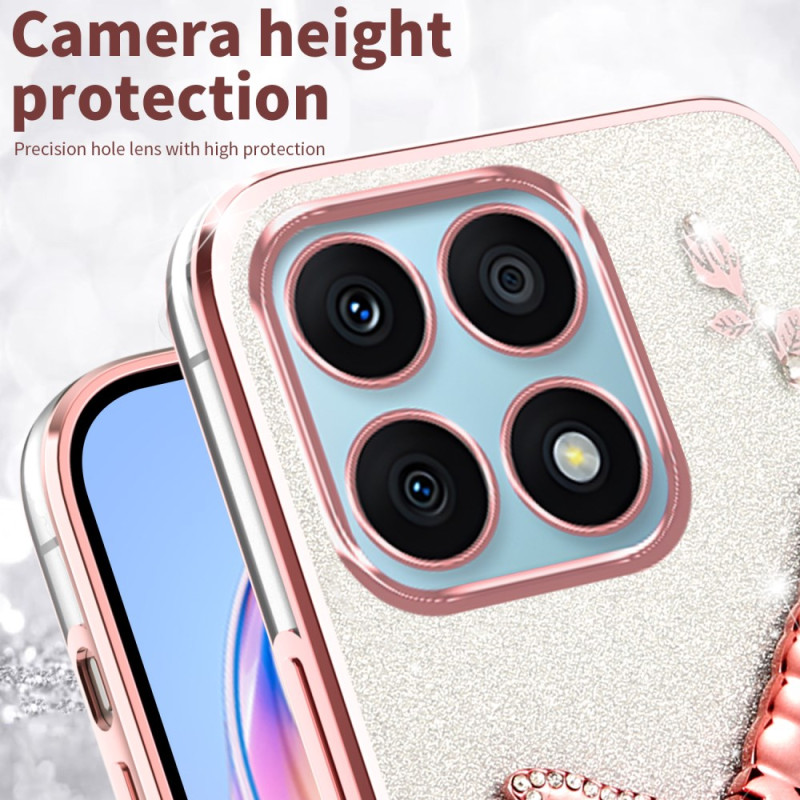 Protégez votre Honor X6a 4G avec élégance grâce à cette coque scintillante ornée de fleurs et strass. Son support libellule intégré permet un visionnage mains libres, tandis que sa conception en TPU durable assure une protection optimale au quotidien.