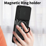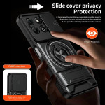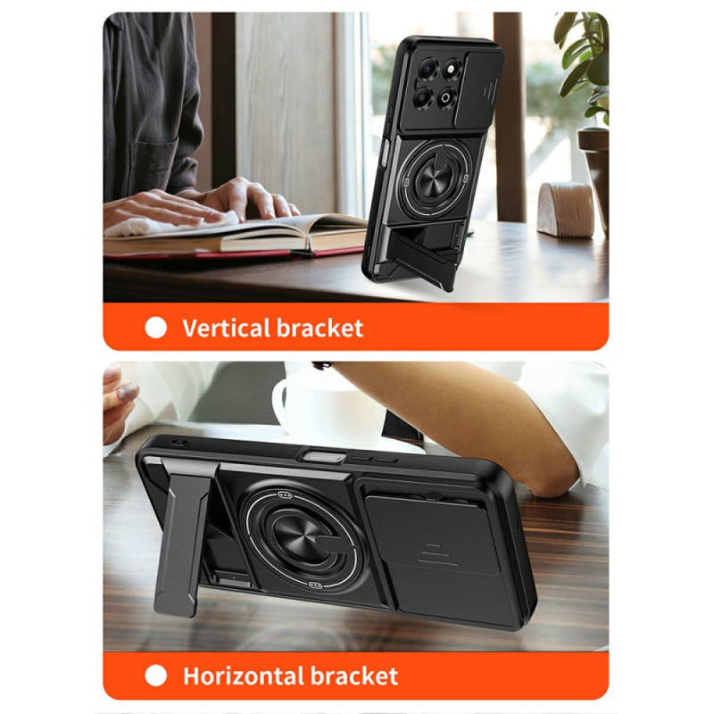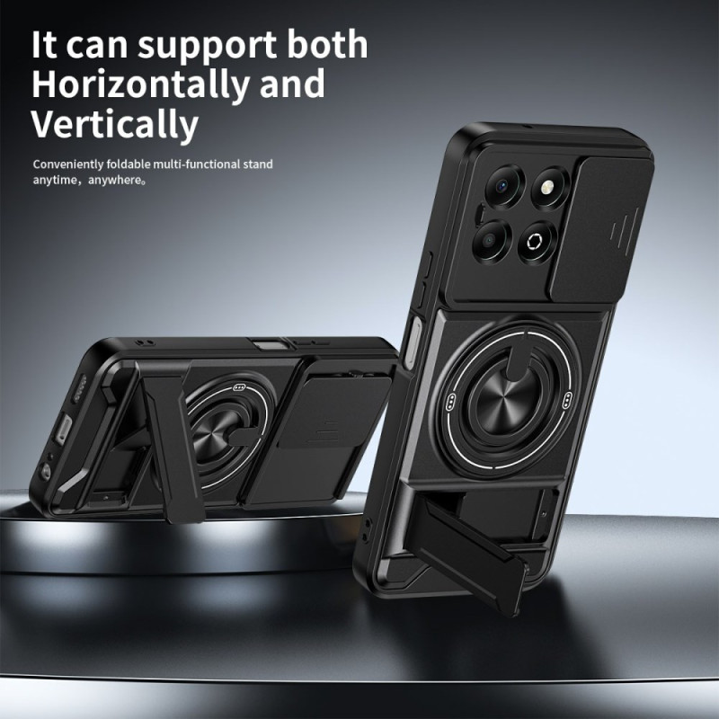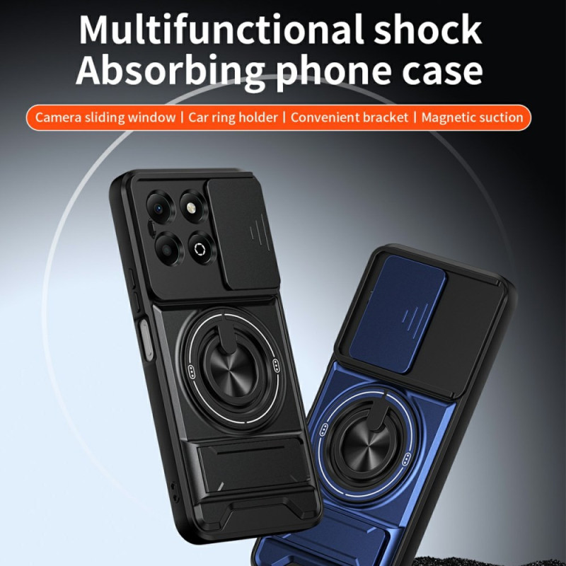 Protégez votre Honor X6b 4G avec cette coque magnétique multifonction. Dotée d'un anneau rotatif 360°, d'un support pliable et d'un cache coulissant pour objectif, elle allie protection renforcée et praticité au quotidien.