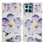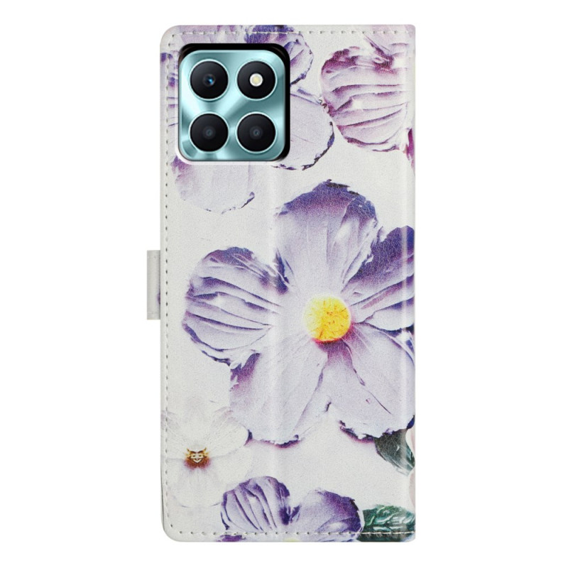 Étui portefeuille élégant avec motif fleur violette pour Honor X6c 4G. Design tout-en-un avec 2 emplacements pour cartes, 1 compartiment photo et poche latérale spacieuse. Support pliable intégré pour visionnage mains libres.