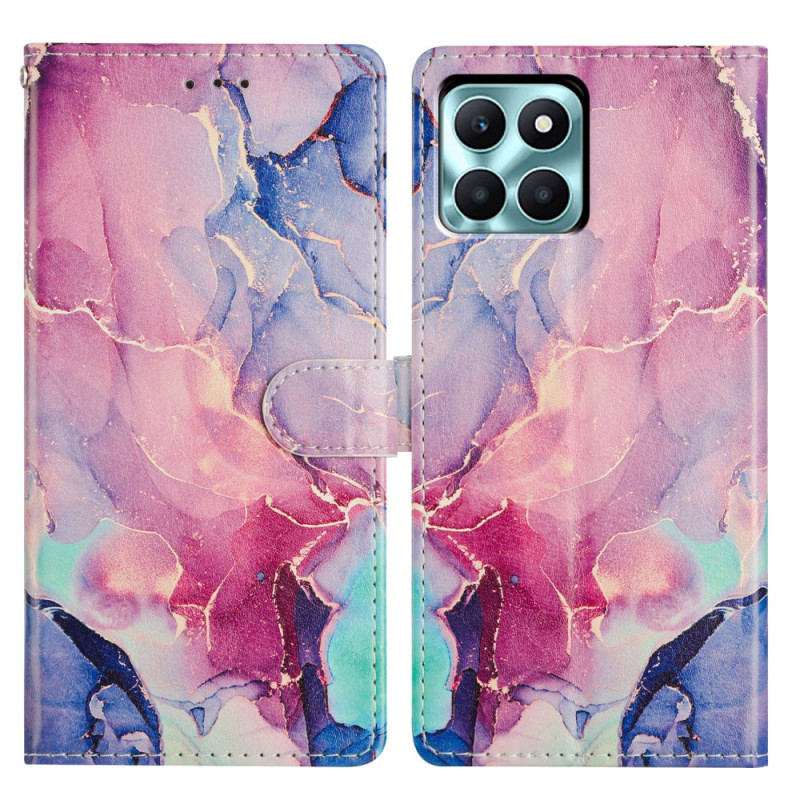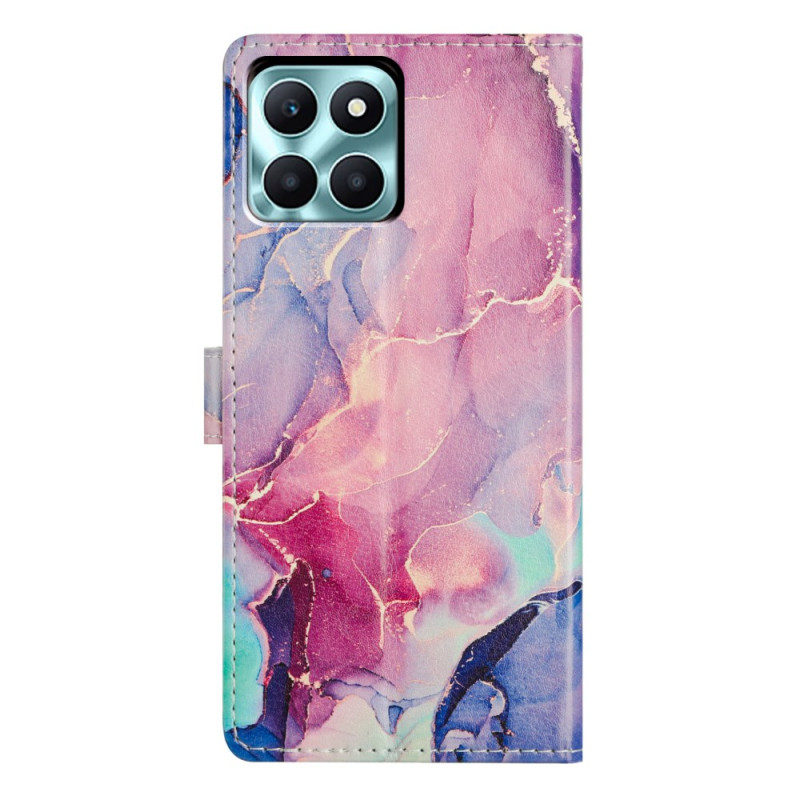 Étui portefeuille élégant en simili cuir avec motif marbre vert et rose pour Honor X6c 4G. Design tout-en-un avec 2 emplacements pour cartes, 1 compartiment photo et poche latérale. Support intégré pour visionnage mains libres et dragonne détachable.