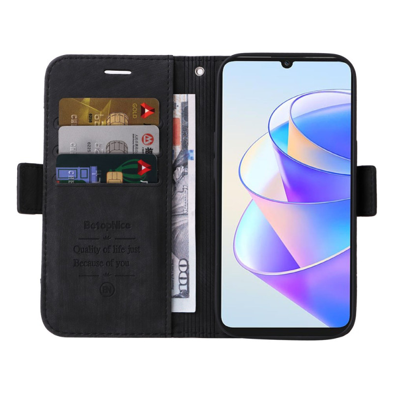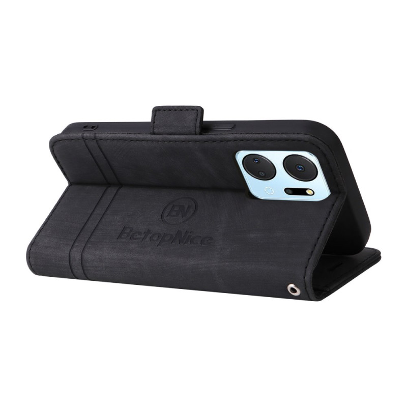 Étui portefeuille élégant en cuir PU avec support intégré pour Honor X7a 4G. Doté de 3 fentes pour cartes, 1 poche pour billets et d'une fermeture magnétique double pour une sécurité optimale. Design sophistiqué avec motif de lignes imprimées.