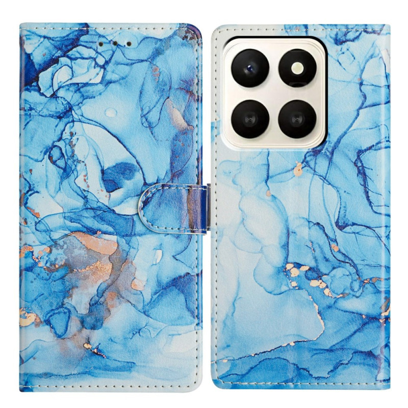 Élégant étui portefeuille à rabat avec un magnifique motif marbre bleu. Comprend 2 fentes pour cartes, 1 compartiment photo et une poche latérale spacieuse. Support intégré pliable pour un visionnage mains libres et dragonne détachable pour un transport facile.