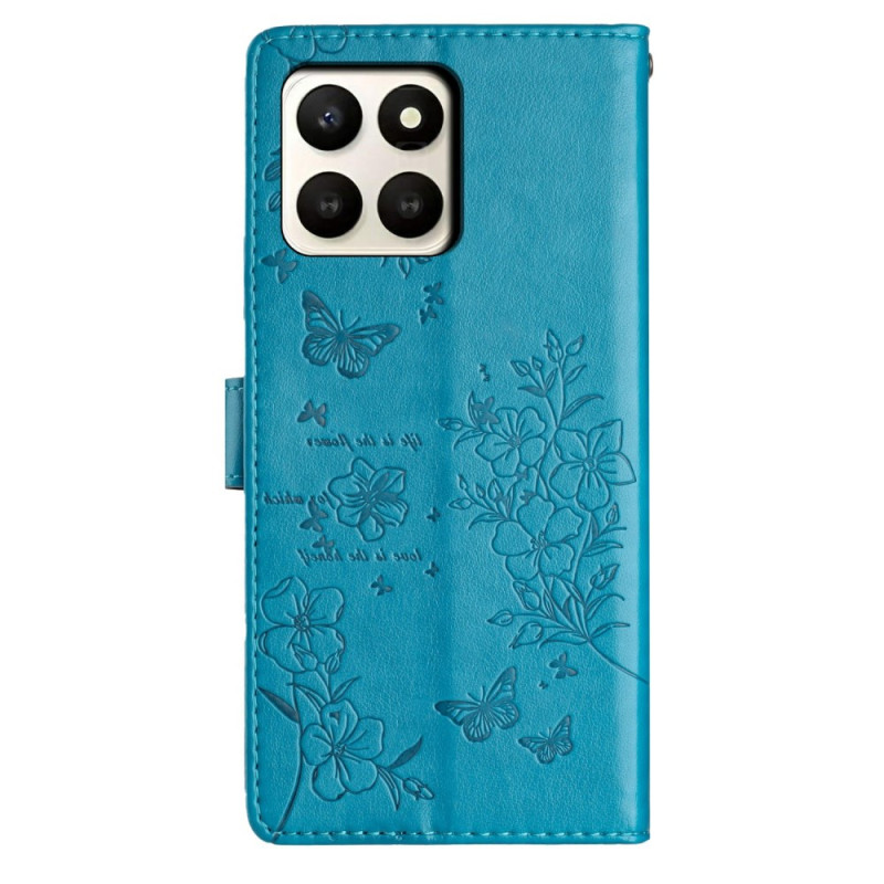 Étui portefeuille élégant pour Honor X7d 5G avec impression florale et papillons. Design à rabat en cuir PU avec support intégré, fentes pour cartes et dragonne pratique. Protection complète contre les chocs et rayures.