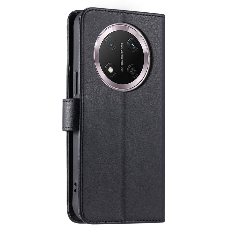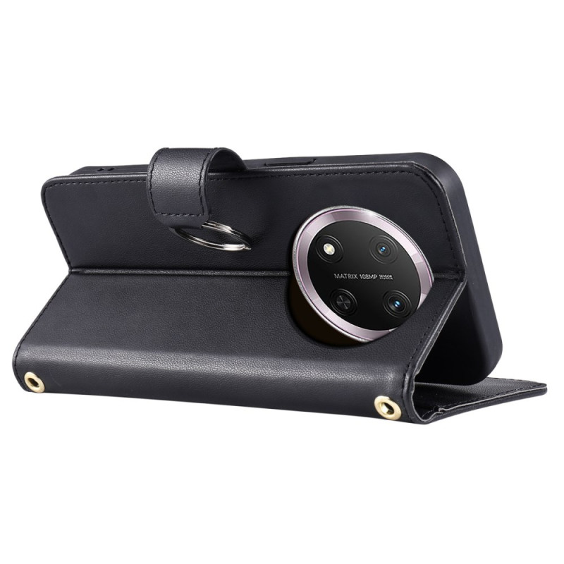 Étui portefeuille élégant avec design losange sophistiqué, boucle anneau distinctive et support multifonction. Comprend 5 fentes pour cartes, une poche à monnaie et deux sangles amovibles pour un port à la main ou en bandoulière.