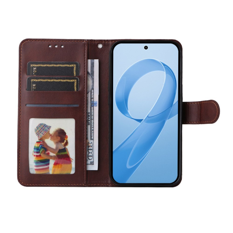 Étui portefeuille élégant en cuir PU avec texture grain de veau, 3 emplacements pour cartes, support intégré et dragonne amovible. Livré avec un protecteur d'écran ultra-fin de 0,18mm compatible avec le déverrouillage par empreinte digitale ultrasonique.