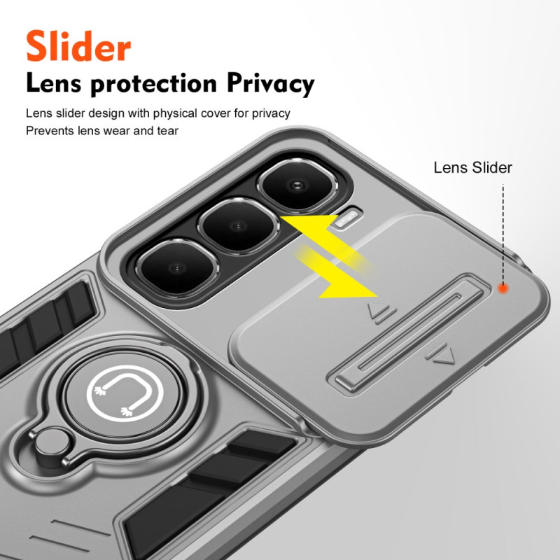 Protection robuste en PC et TPU pour votre Infinix Hot 60 5G. Dotée d'un cache caméra coulissant innovant, d'un anneau support magnétique et d'un support de visionnage intégré. Offrez à votre smartphone une défense complète contre les chocs.