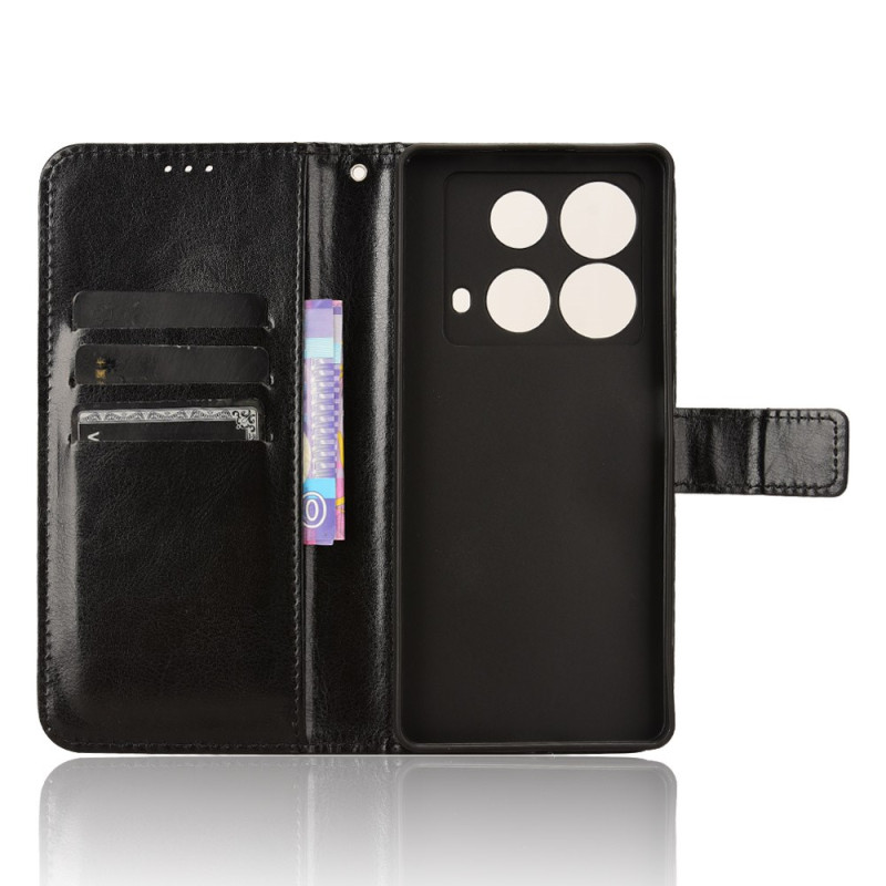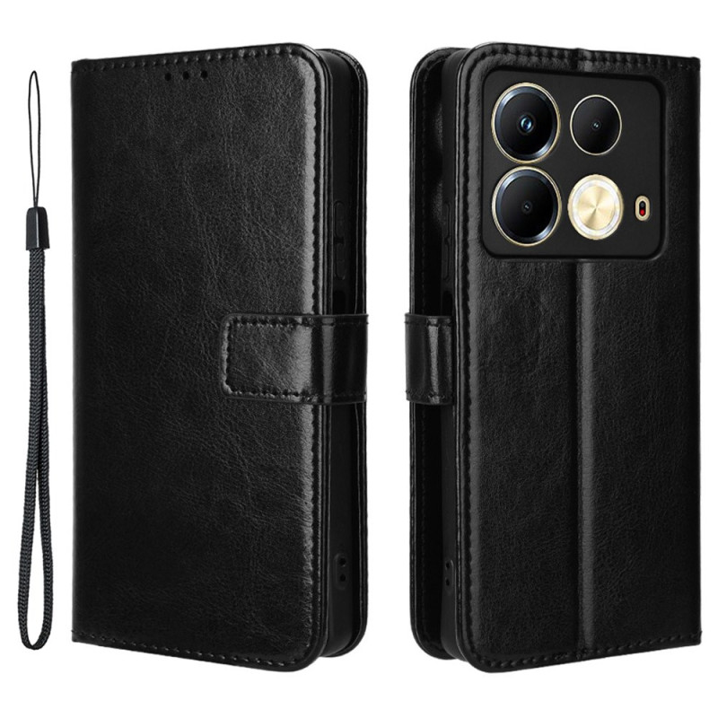 Étui portefeuille élégant en cuir PU avec texture grain pour Infinix Note 40 X6853. Doté de 3 emplacements pour cartes, d'un compartiment pour billets et d'une fonction support mains libres. Fermeture magnétique sécurisée et dragonne incluse pour un transport facile.