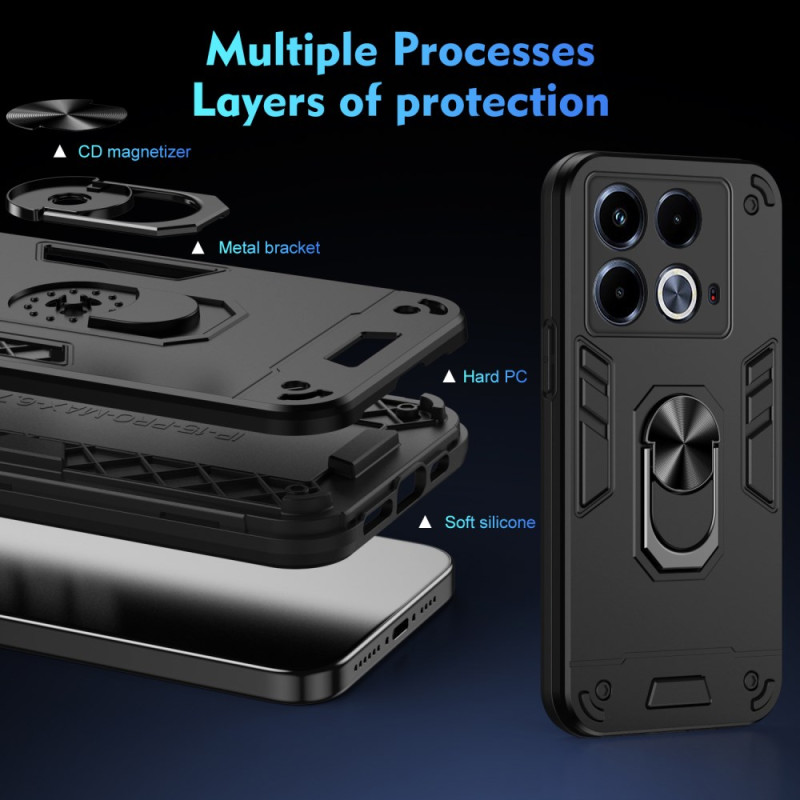 Protégez votre Infinix Note 40 avec cette coque robuste dotée d'une béquille rotative ajustable et d'une compatibilité support voiture. Construction durable en PC et TPU, rebords surélevés pour protéger l'écran et la caméra, découpes précises.