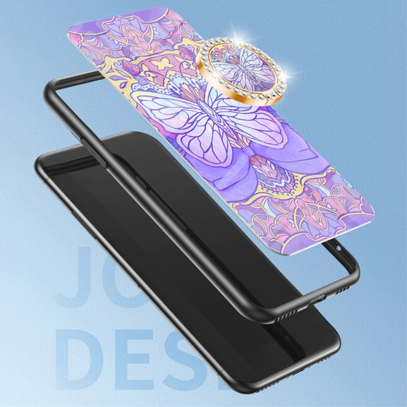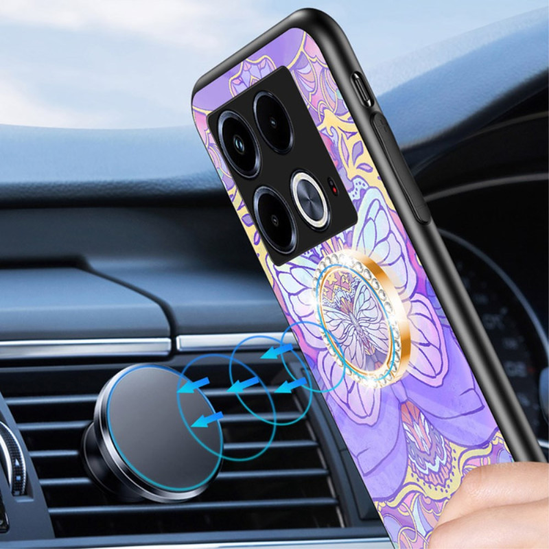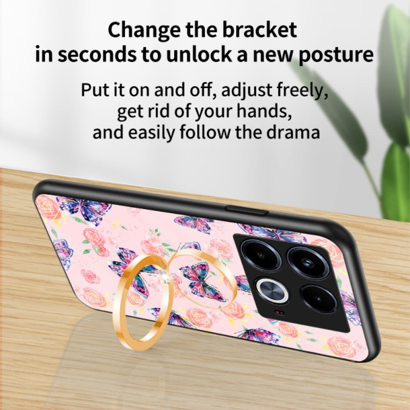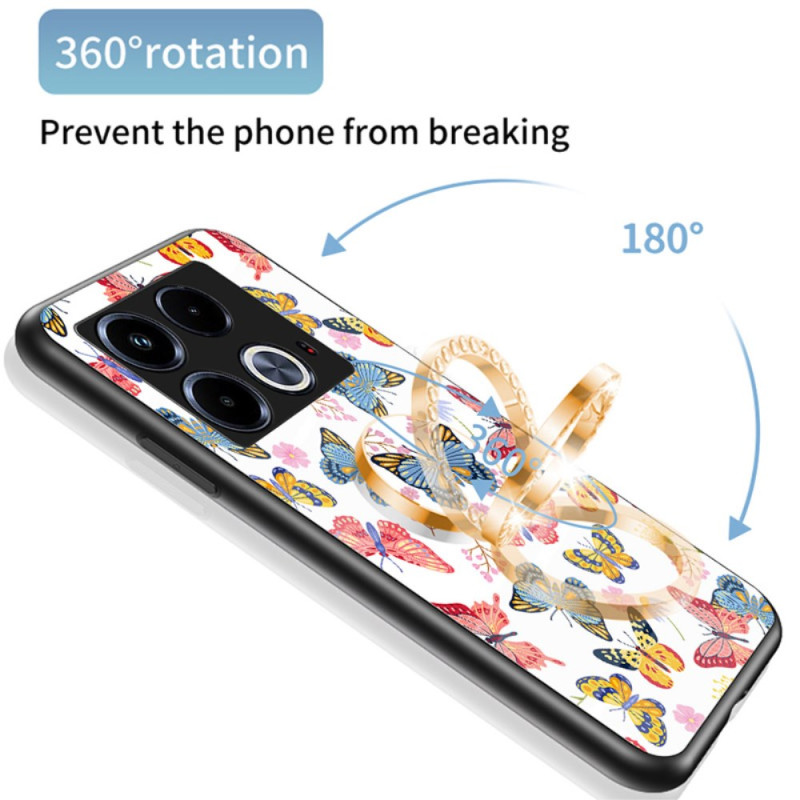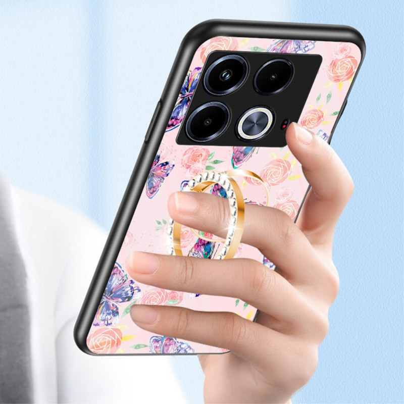 Protégez votre Infinix Note 40 avec style grâce à cette coque robuste en verre trempé. Son design multicouche combine plastique dur, bordure TPU souple et dos en verre pour une protection optimale contre les chocs. L'anneau support métallique pliable offre un visionnage confortable.