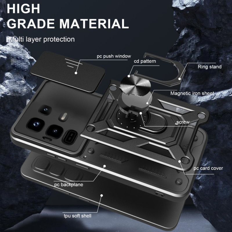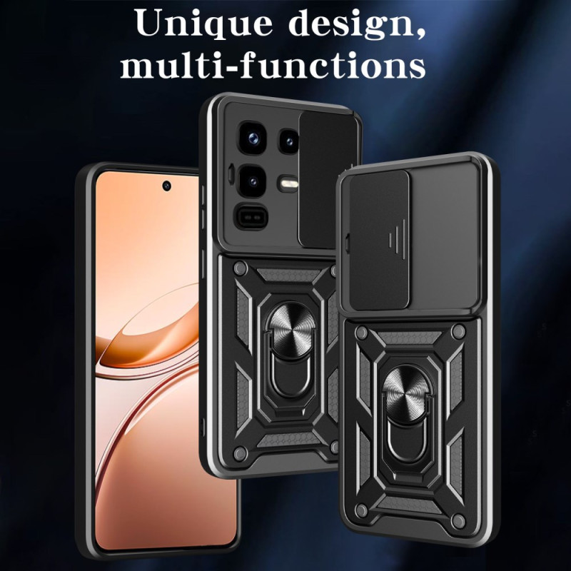 Protégez votre Infinix Note 50 Pro 4G avec cette coque multifonction dotée d'une protection caméra coulissante, d'une béquille rotative à 360° et d'une plaque magnétique intégrée. Design robuste offrant une protection militaire contre les chocs.