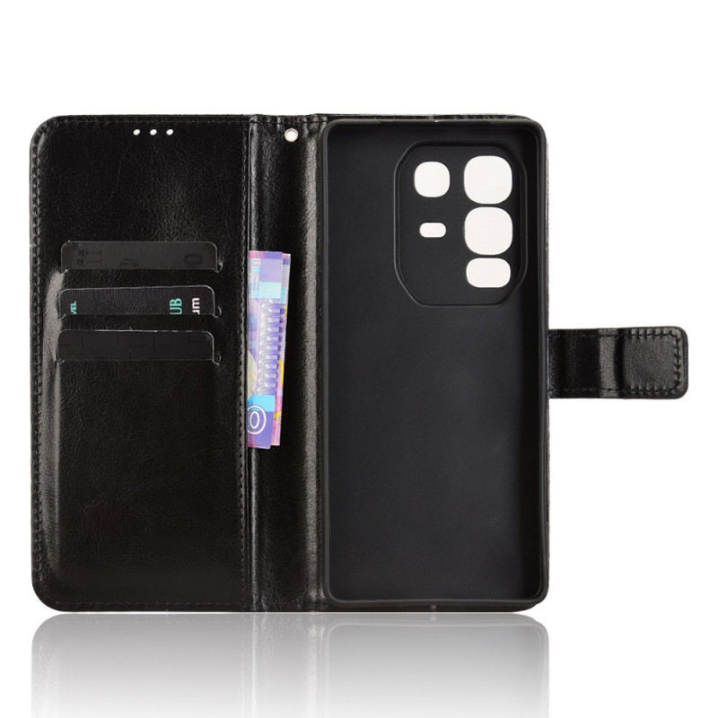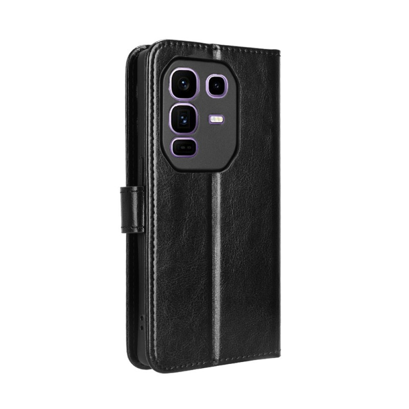 Étui portefeuille élégant en cuir PU texture cheval fou pour Infinix Note 50 Pro Plus 5G. Doté de 3 emplacements pour cartes, d'un compartiment pour billets, d'une fermeture magnétique sécurisée et d'une dragonne pratique. Support mains libres intégré.