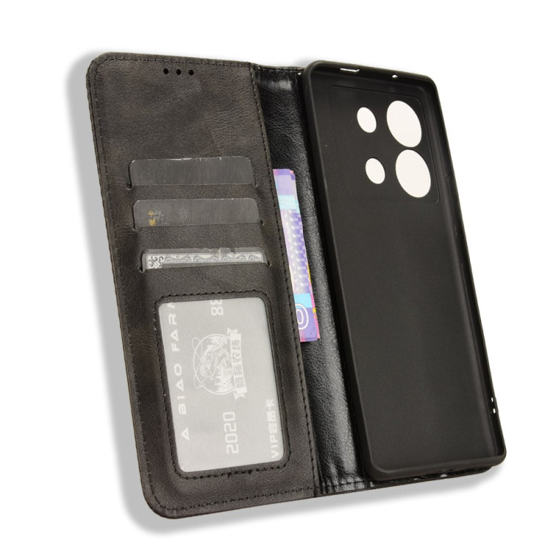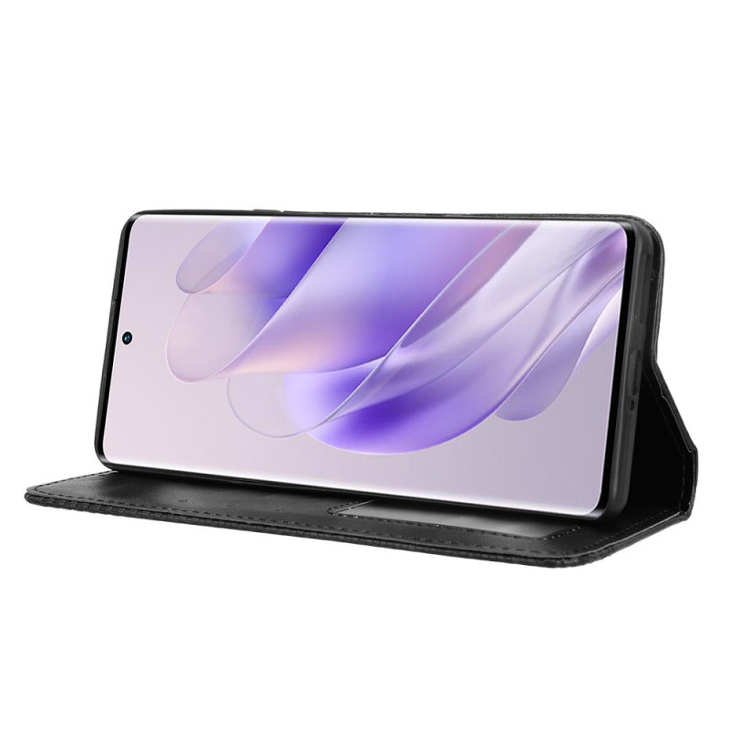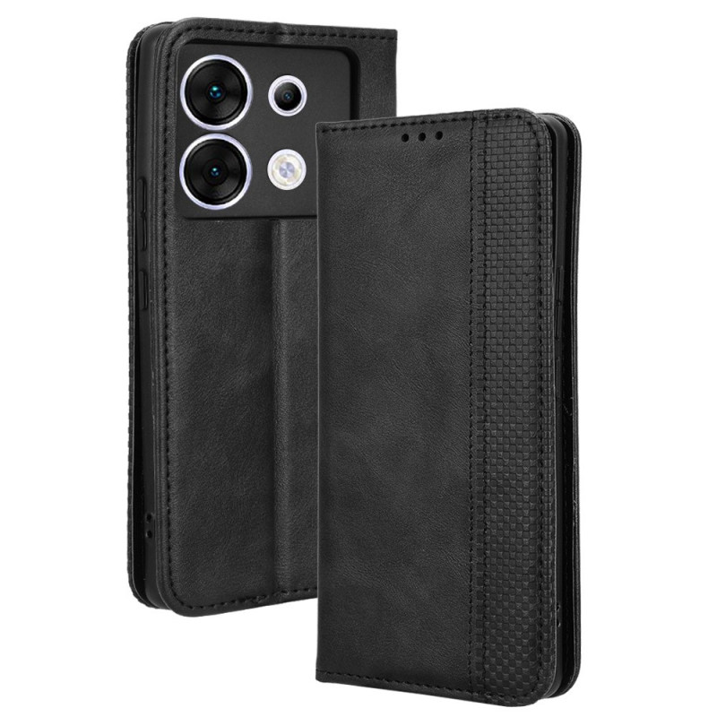Étui portefeuille élégant en cuir PU rétro pour Infinix Zero 30 5G. Design raffiné avec bordure mosaïque gravée, porte-cartes intégrés et support ajustable. Fermeture magnétique automatique pour une protection complète et un usage pratique au quotidien.