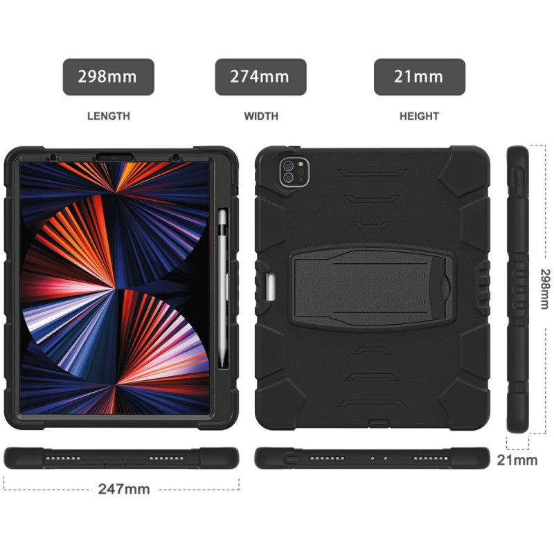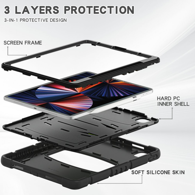 Cette coque avec support mains libres offre une triple protection au iPad Pro 12.9" (2022) (2021) (2020) en plus d'être pratique.