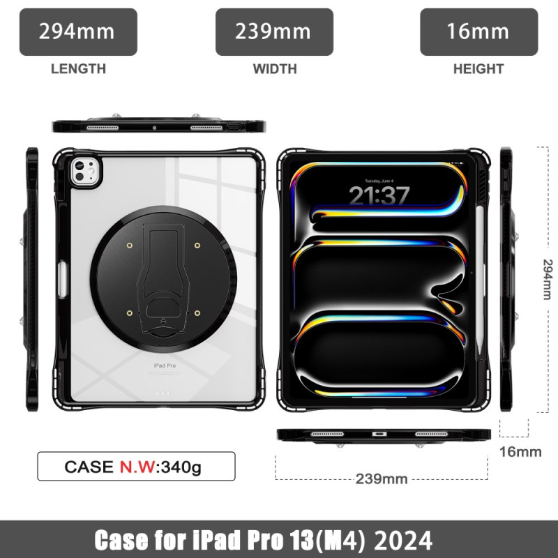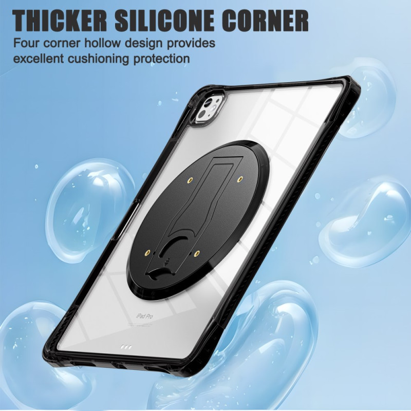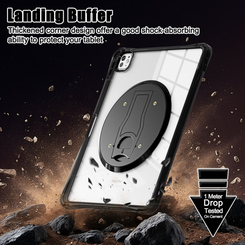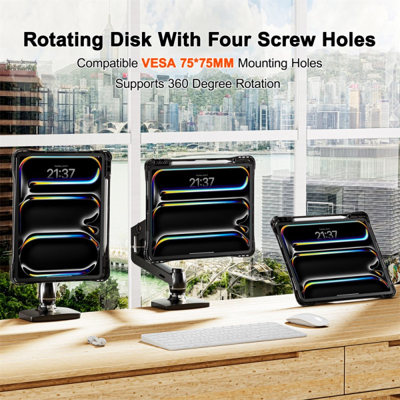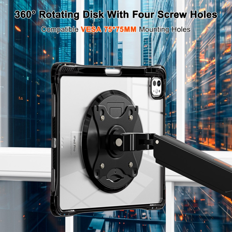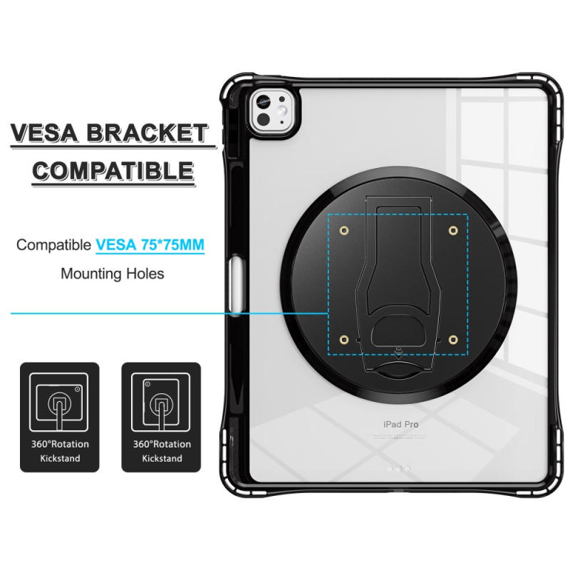 Découvrez notre étui robuste et polyvalent pour iPad Pro. Doté d'un support rotatif à 360°, de bords surélevés pour une protection accrue et d'une conception résistante à la poussière. Son dos transparent en acrylique met en valeur votre tablette tout en offrant une protection fiable. Compatible VESA pour un montage facile.