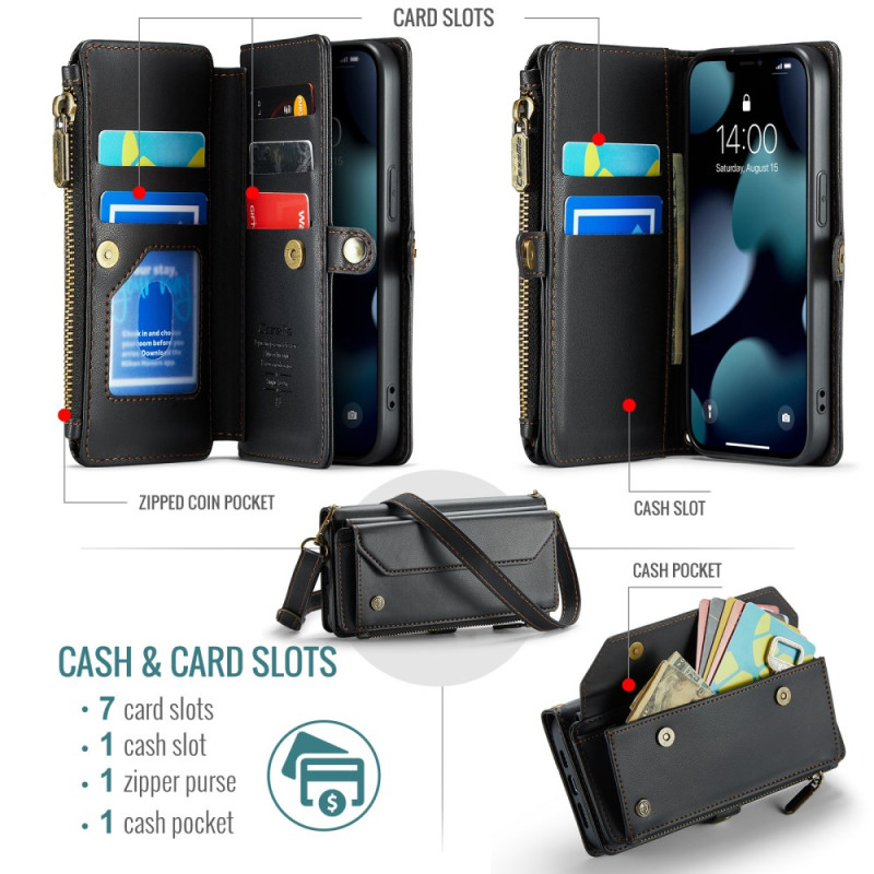 Découvrez l'étui multifonction CASEME pour iPhone 13 mini : protection RFID, 10 emplacements pour cartes, porte-monnaie zippé et bandoulière amovible. Alliez style, sécurité et praticité avec ce portefeuille en cuir PU premium.