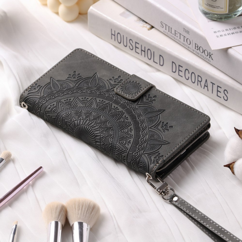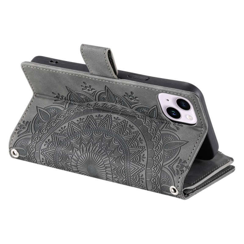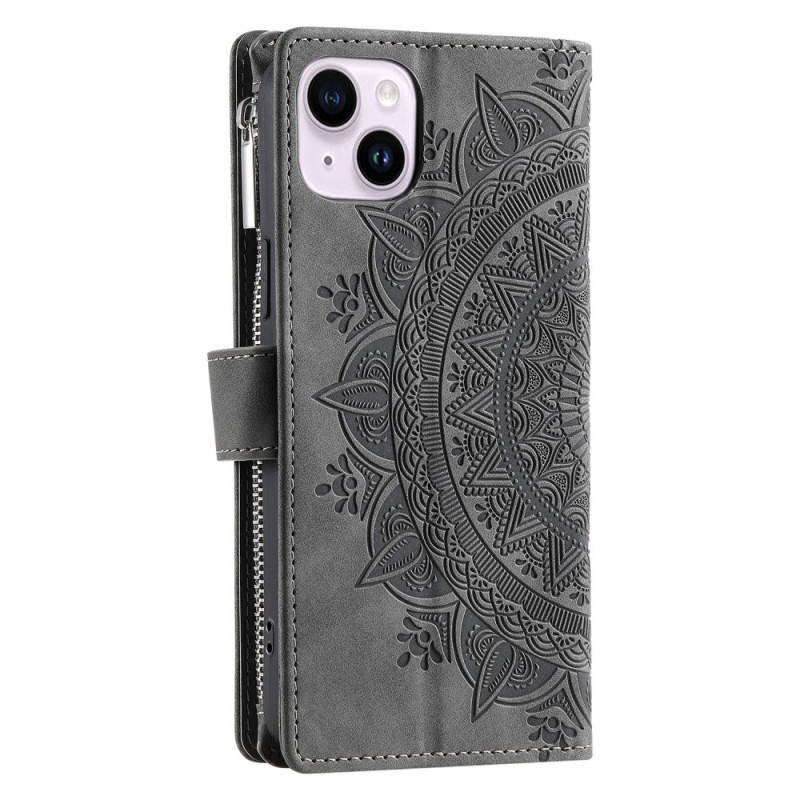 Étui portefeuille élégant pour iPhone 13 Mini avec motif mandala gravé. Comprend plusieurs emplacements pour cartes, une poche zippée, une fermeture magnétique sécurisée et une dragonne pratique. Fonction support intégrée pour un visionnage mains libres.