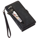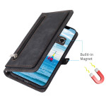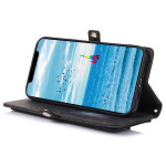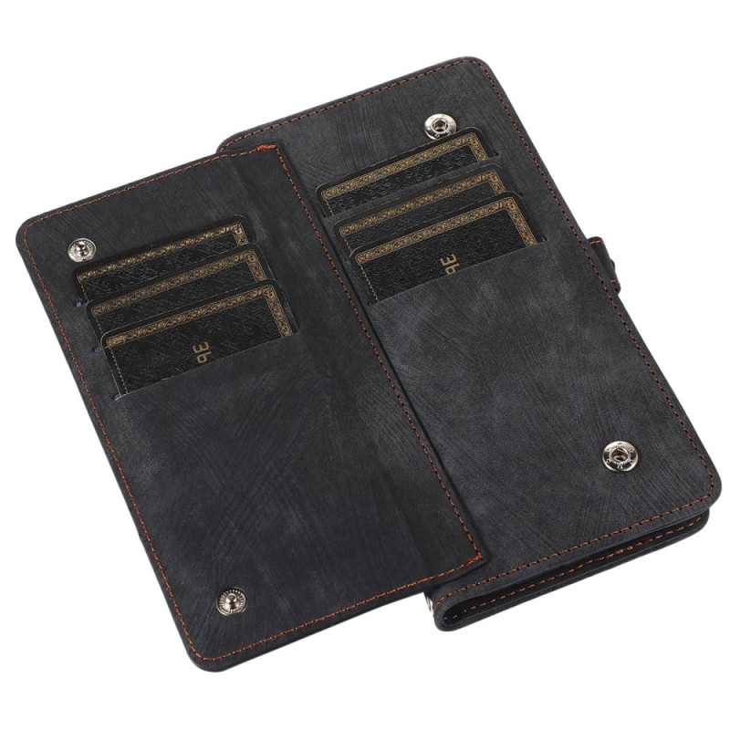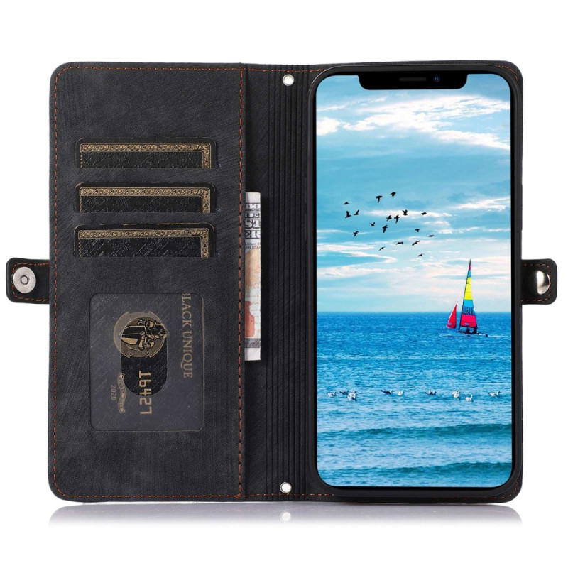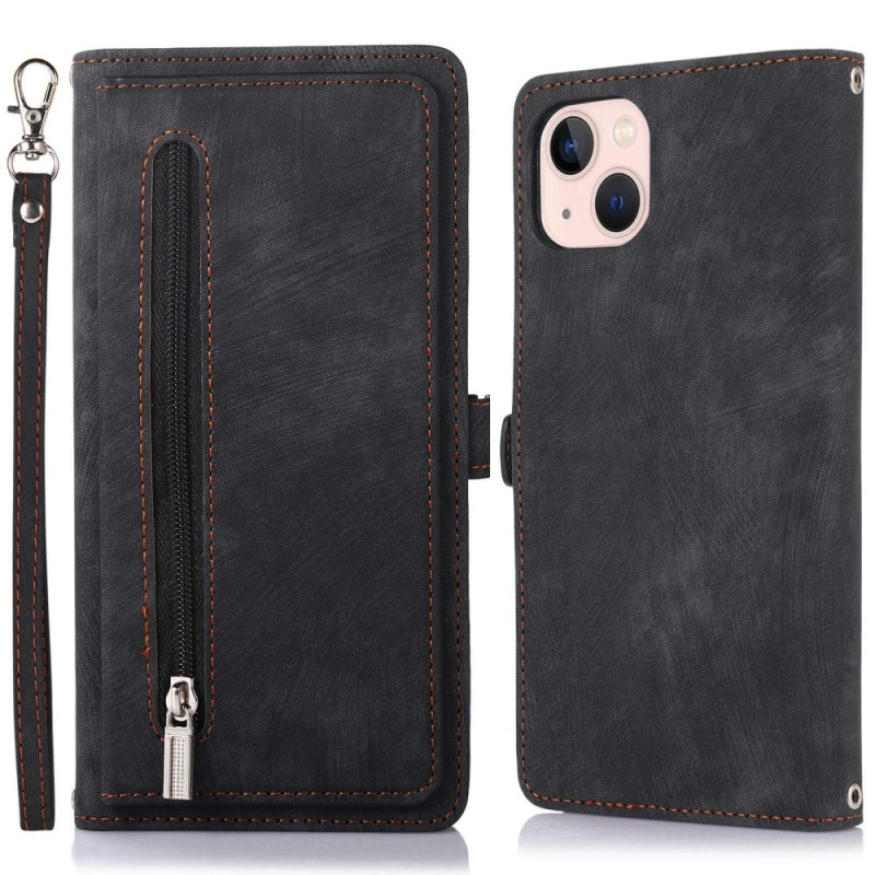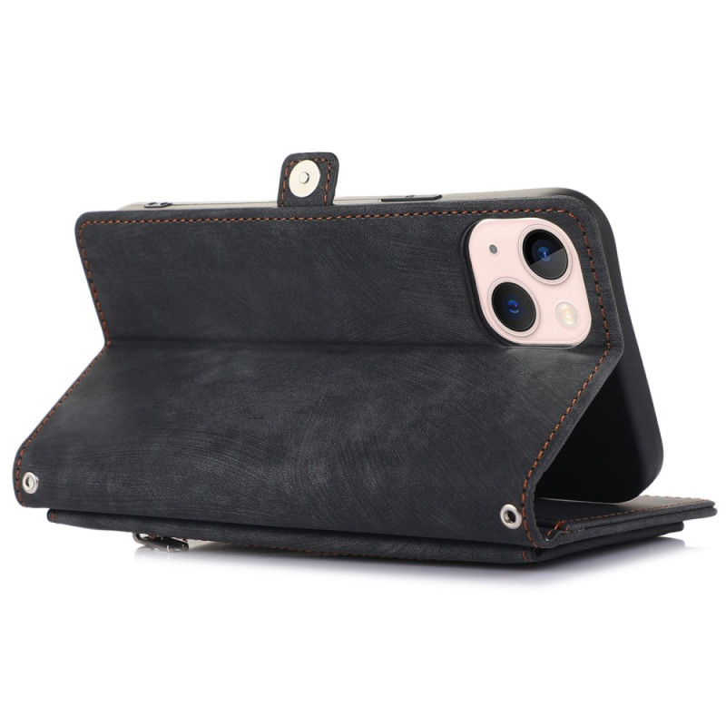 Étui portefeuille multifonctionnel en cuir PU pour iPhone 13 mini. Dispose de 9 emplacements pour cartes, d'une poche zippée sécurisée et d'un support intégré. Livré avec une dragonne détachable pour un transport pratique au quotidien.
