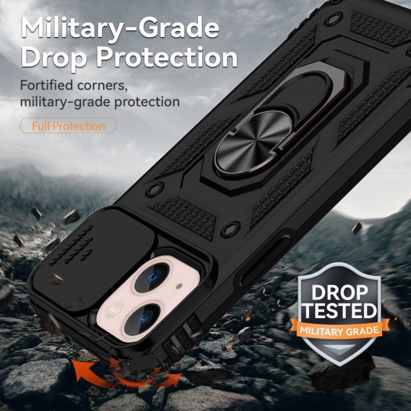 Protégez votre iPhone 13 Mini avec cette coque innovante dotée d'une protection caméra coulissante, d'un anneau support rotatif à 360° et d'une plaque magnétique intégrée. Conception hybride robuste pour une protection optimale au quotidien.