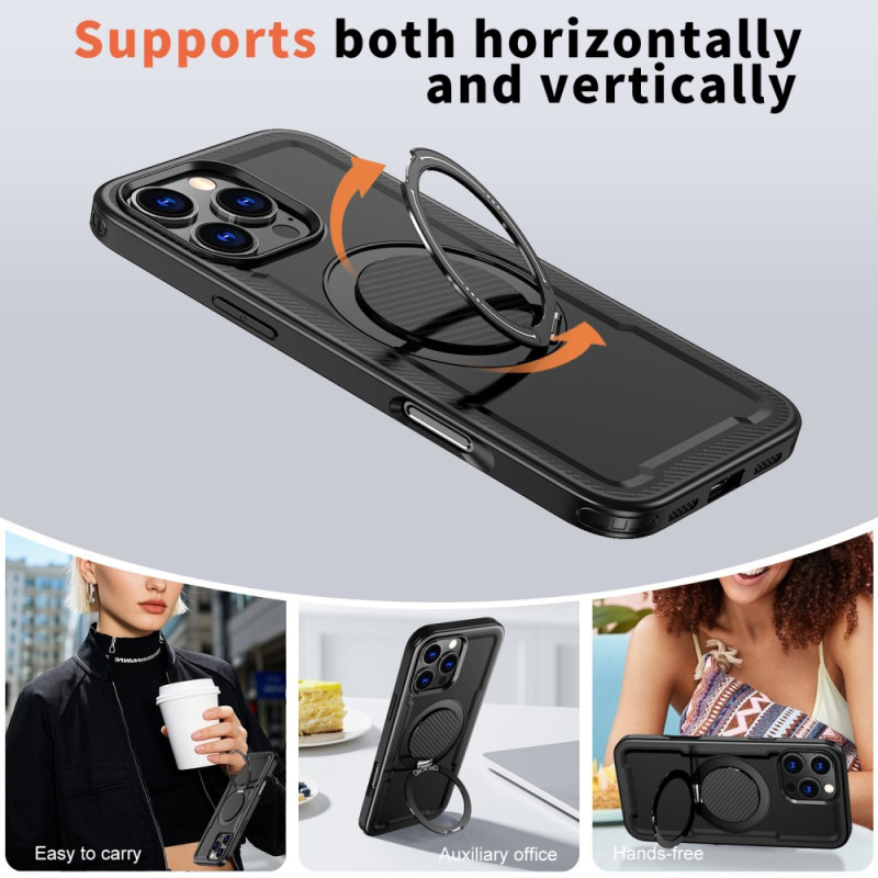 Protégez votre iPhone avec style grâce à cette coque innovante compatible MagSafe. Dotée d'une béquille rotative à 360°, elle offre une protection renforcée tout en facilitant le visionnage mains libres. Construction hybride durable et découpes précises pour un accès optimal.