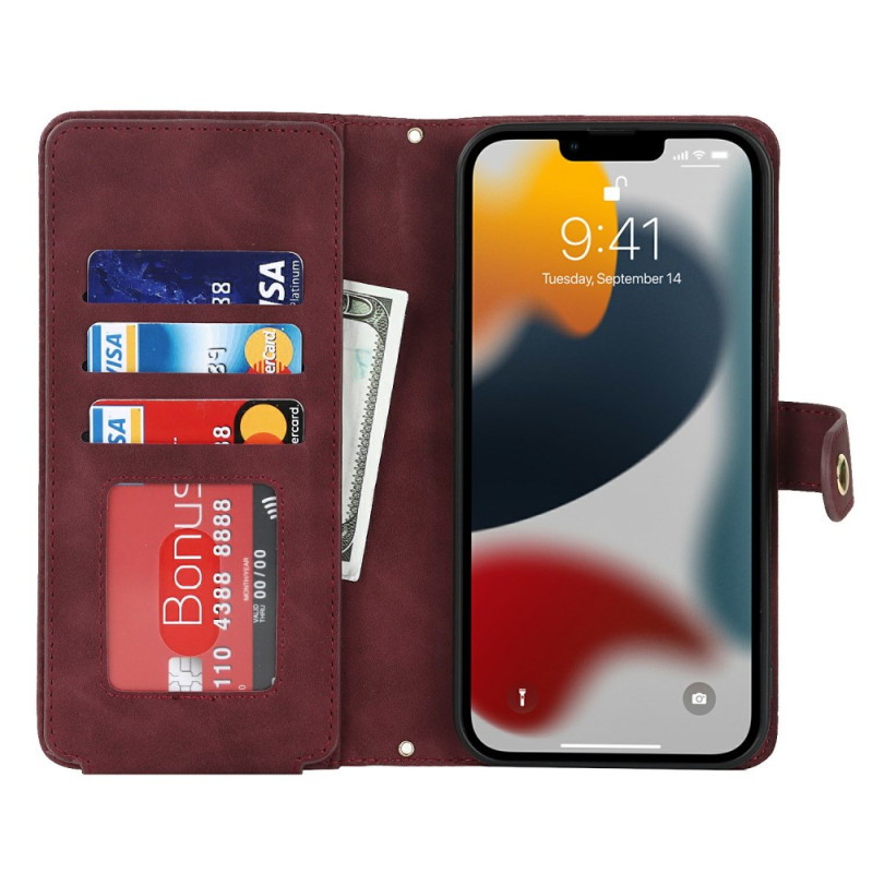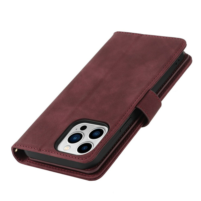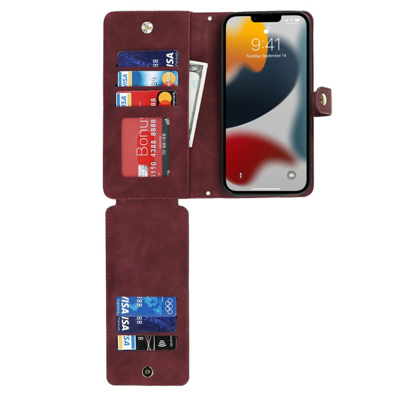 Découvrez cet étui multifonction en cuir PU vintage pour iPhone 13 Pro Max et 12 Pro Max. Doté de multiples fentes pour cartes, d'une poche zippée et de deux bandoulières amovibles, il combine élégance et praticité au quotidien.