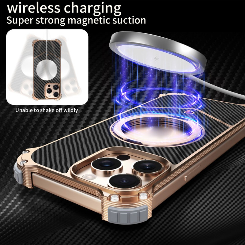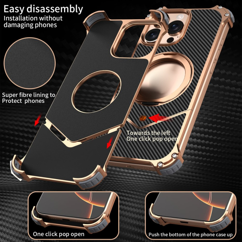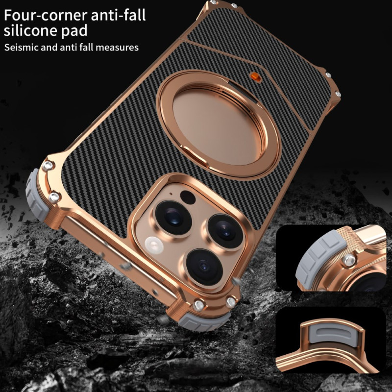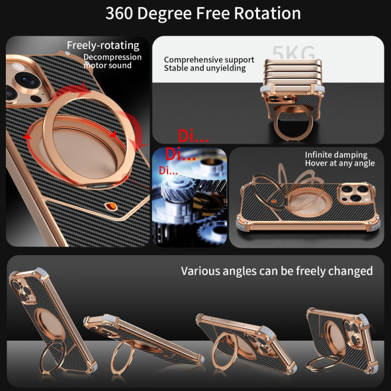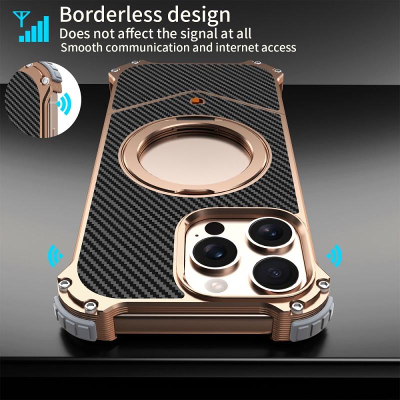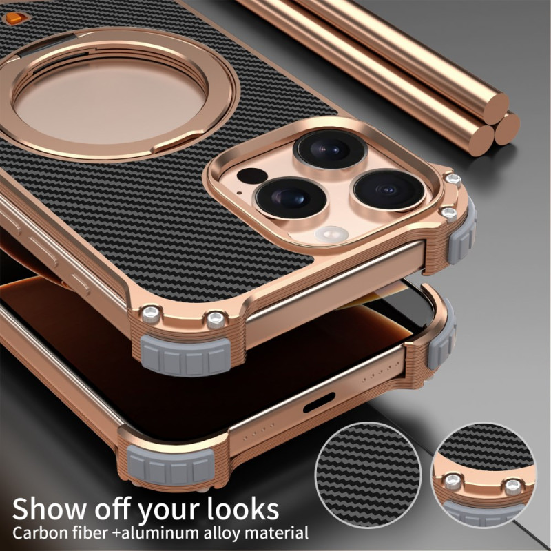 Protégez votre iPhone 13 Pro Max avec élégance grâce à cette coque magnétique au design sans bordure. Texture fibre de carbone raffinée, béquille rotative 360° et protection renforcée aux coins avec coussins d'air anti-choc. Compatible MagSafe pour une recharge sans fil optimale.