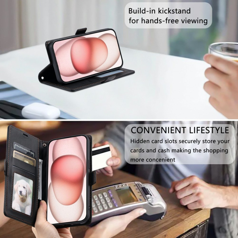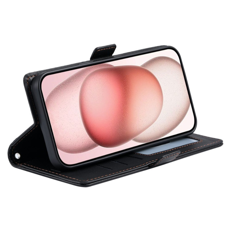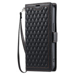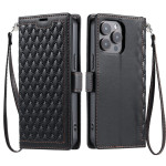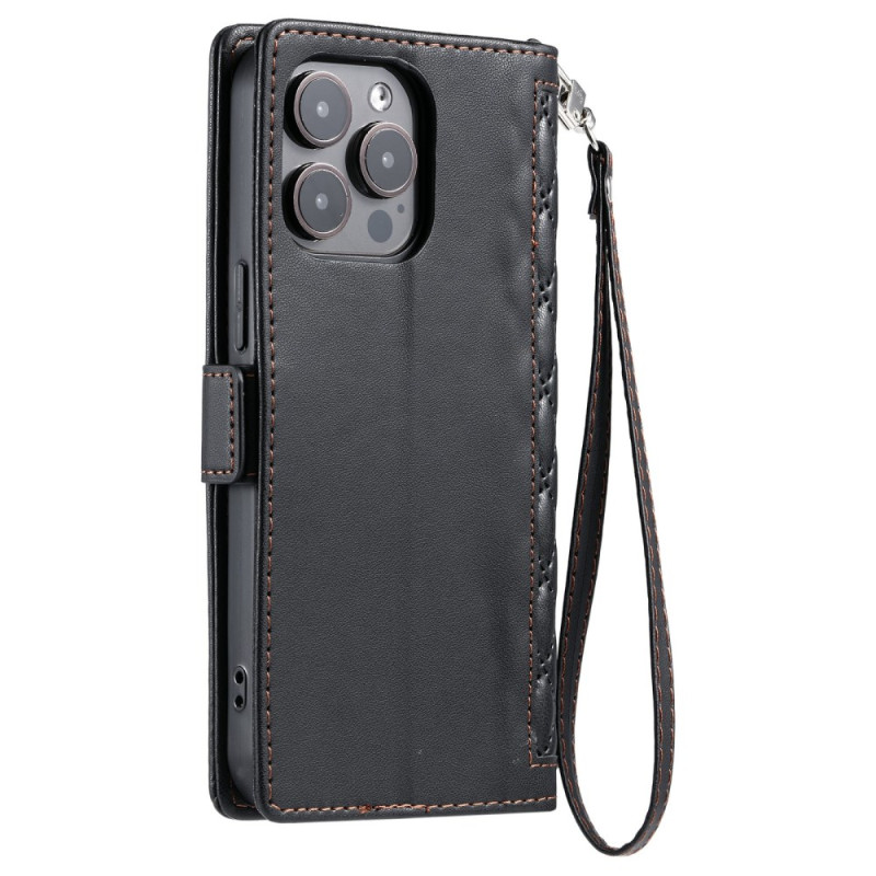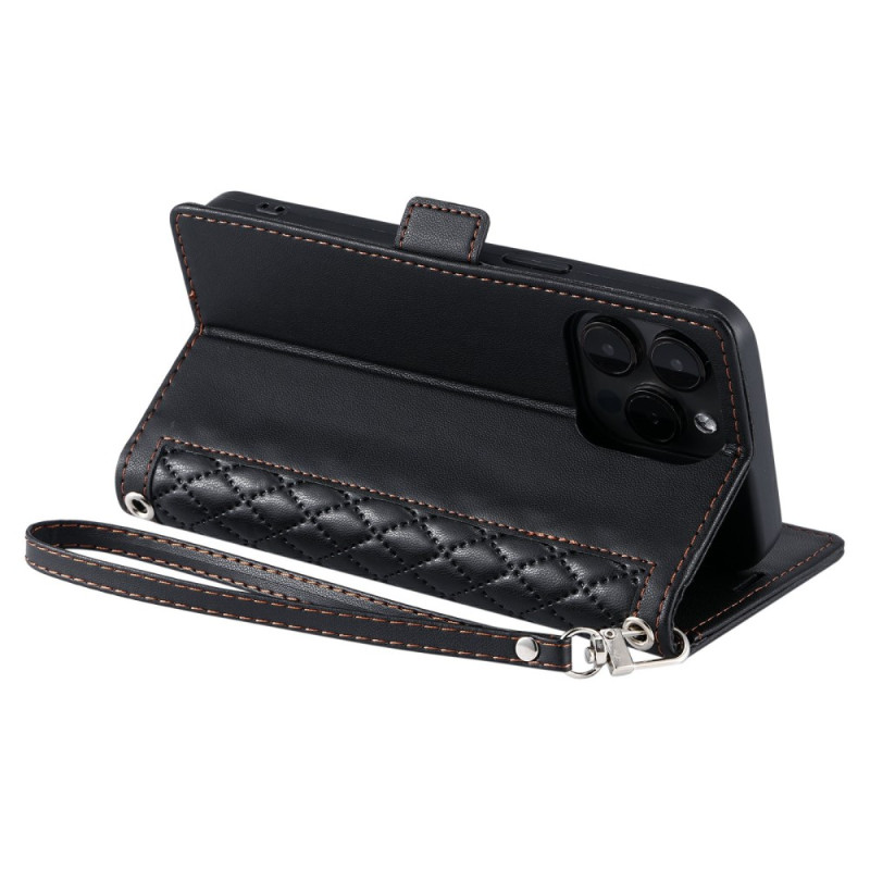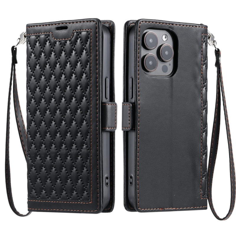 Étui portefeuille élégant pour iPhone 13 Pro Max avec motif losanges raffiné. Doté de 3 emplacements pour cartes, 1 poche pour espèces et une dragonne pratique. Se transforme en support mains libres pour visionner vos contenus confortablement.
