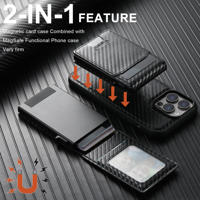 Étui magnétique 2-en-1 innovant avec texture élégante et porte-cartes détachable. Protection intégrale contre les chocs et rayures. Compatible MagSafe et chargement sans fil. Rangement sécurisé pour 6-8 cartes avec fonction support.