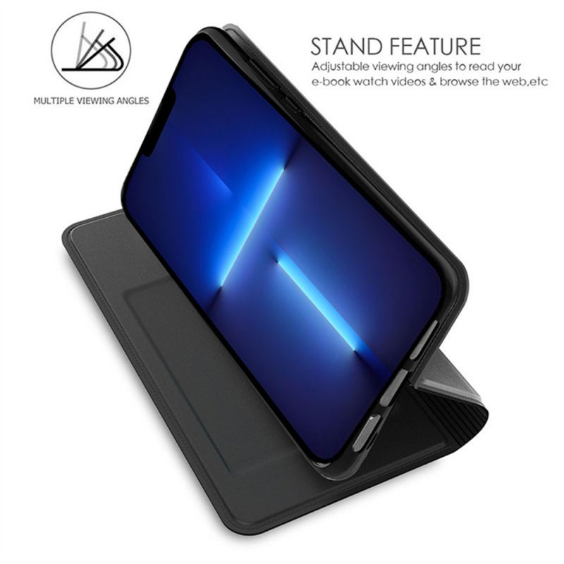 Protégez votre iPhone 13 Pro Max avec élégance grâce à cet étui multifonction en cuir PU texture soie. Doté d'un porte-cartes intégré, d'un support ajustable et d'une fermeture magnétique sécurisée, cet accessoire allie praticité et protection optimale.
