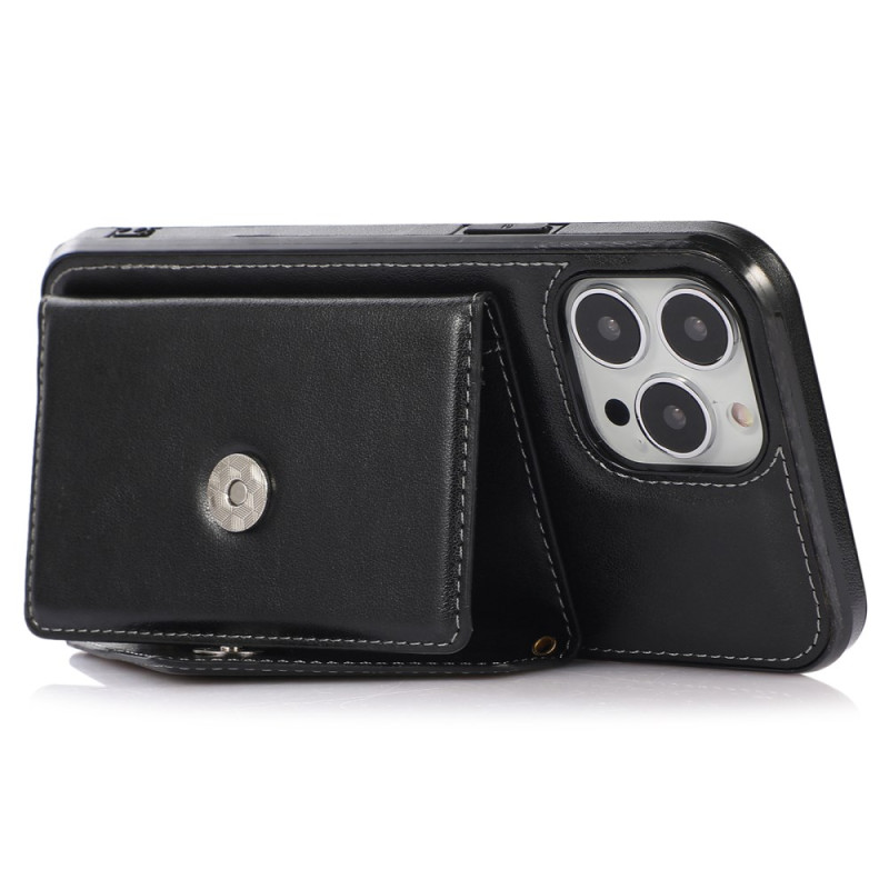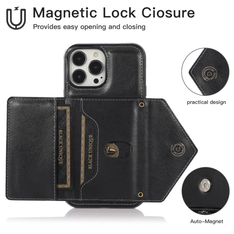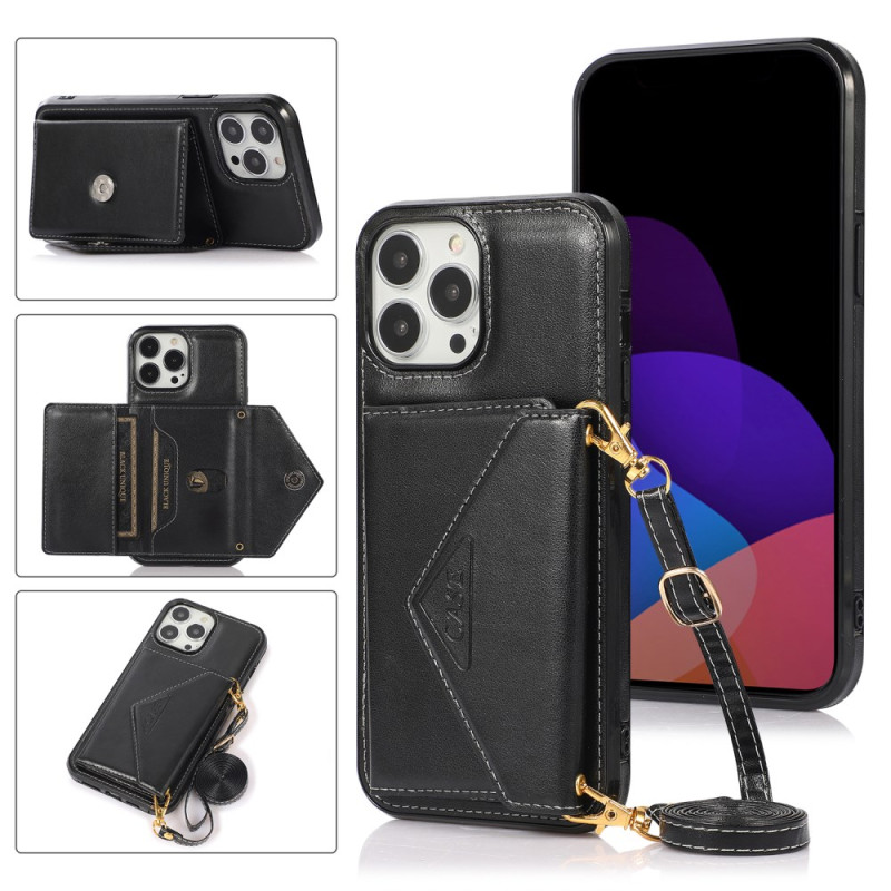 Coque multifonction élégante pour iPhone 13 Pro Max combinant protection premium et praticité. Intègre un porte-cartes magnétique, un support de visionnage mains libres et une bandoulière ajustable de 1,5m détachable pour un usage quotidien simplifié.