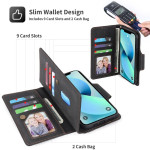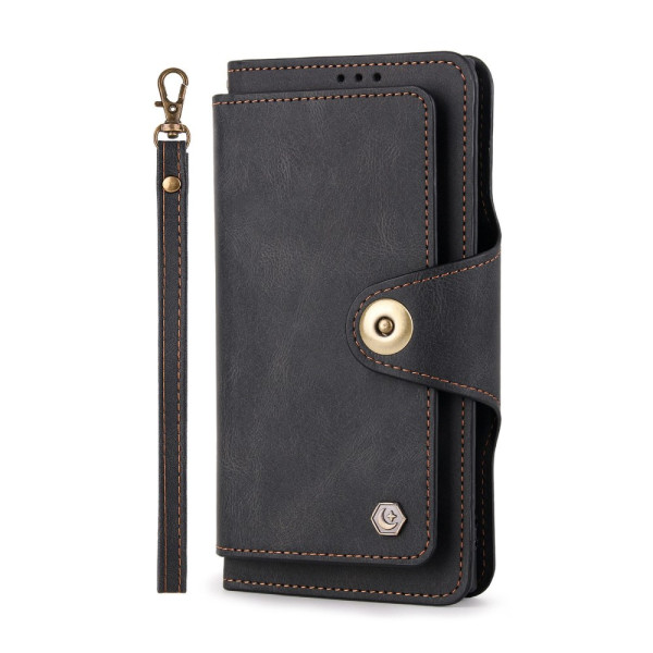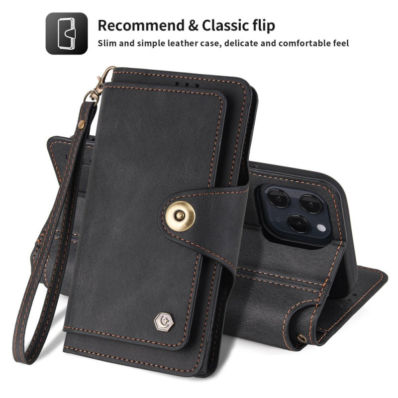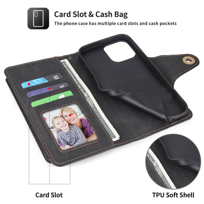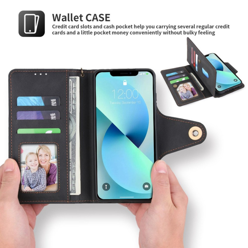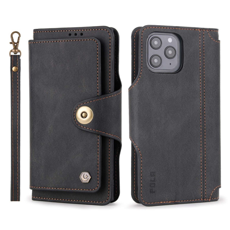 Étui portefeuille élégant pour iPhone 13 Pro avec 9 emplacements pour cartes et 2 poches pour espèces. Design pratique avec support intégré, fermeture à boucle sécurisée et dragonne amovible pour un transport facile au quotidien.